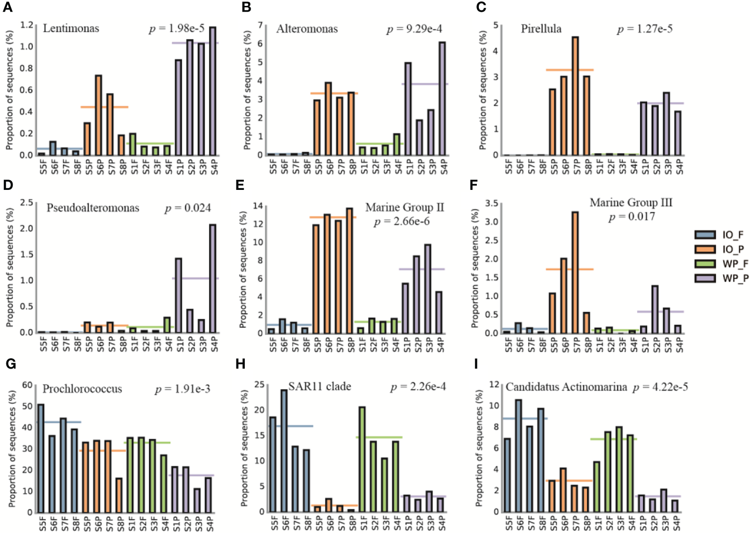 Examples of taxa with significant differences between PA and FL prokaryotes revealed by 16S rRNA gene amplicon sequencing. Relative abundance of (A)Lentimonas, (B)Alteromonas, (C)Pirellula, (D)Pseudoalteromonas, (E) Marine Group II, (F) Marine Group III, (G)Prochlorococcus, (H) SAR11 clade, and (I)Candidatus Actinomarina. The horizontal lines represent the mean values of the relative abundance of PA and FL assemblages. IO, Indian Ocean. WP, West Pacific Ocean. F, free-living. P, particle-associated.