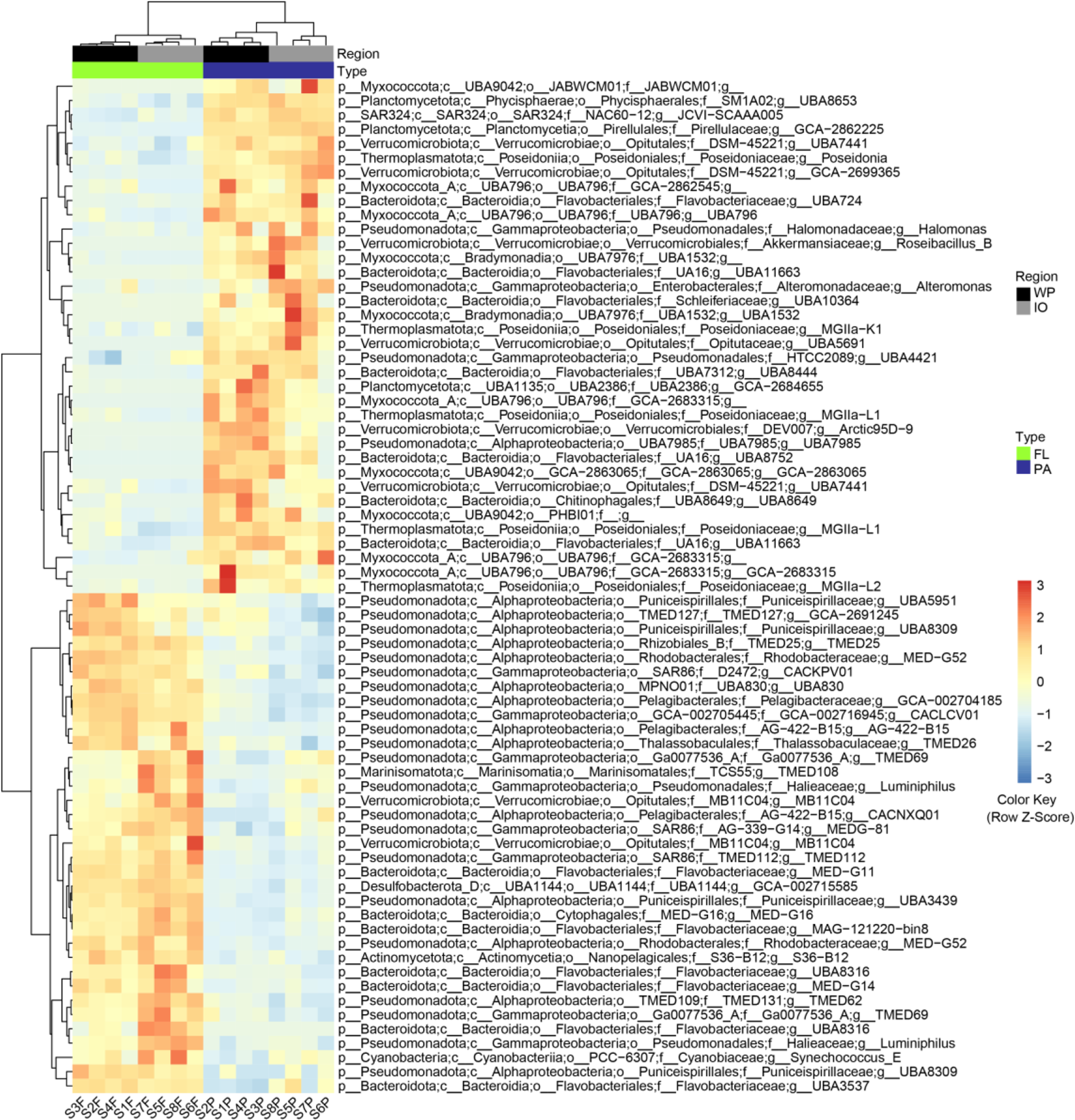 Metagenomic analysis revealed 71 MAGs with significant differences (p < 0.05) in relative abundance between PA and FL assemblages. WP, West Pacific Ocean. IO, Indian Ocean. FL, free-living. PA, particle-associated; p, phylum; c, class; o, order. f, family; g, genus.