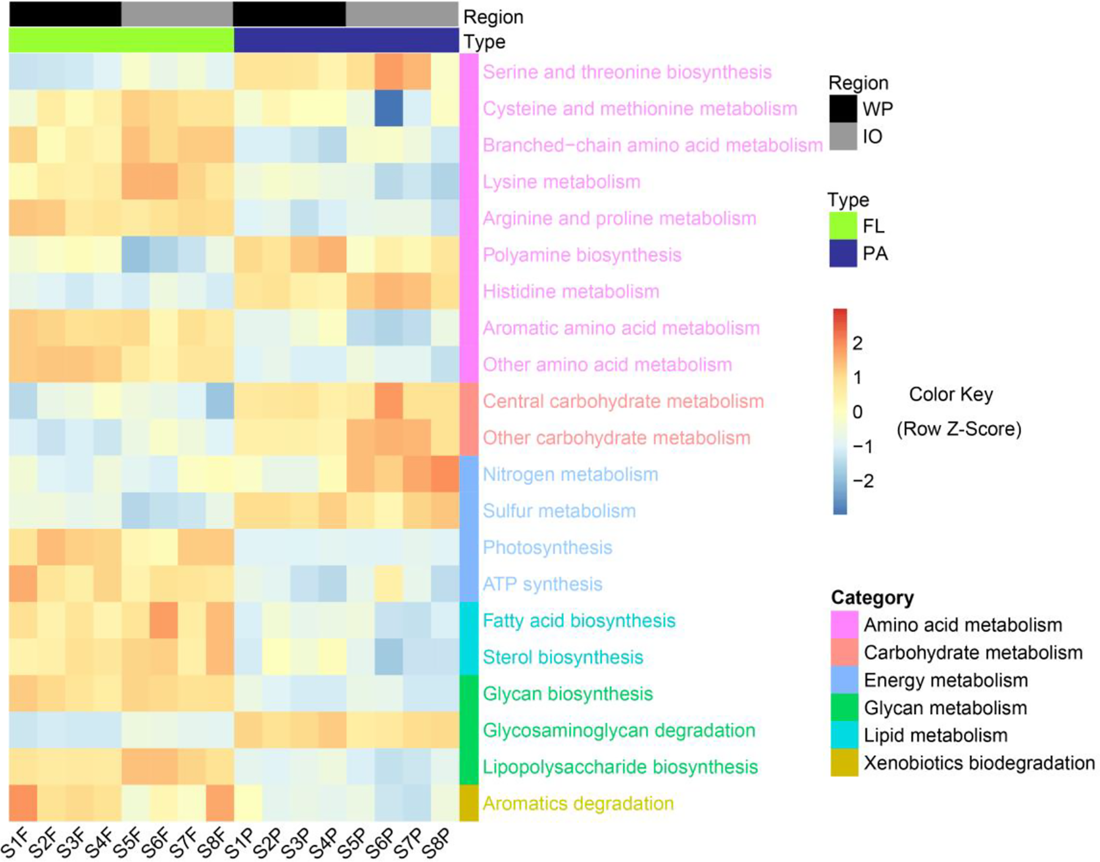Metabolic pathways with significant differences (p < 0.05) in relative abundance between PA and FL assemblages revealed by genome-centric metagenomics. WP, West Pacific Ocean. IO, Indian Ocean. FL, free-living. PA, particle-associated. KEGG pathways were colored according to their functional categories.