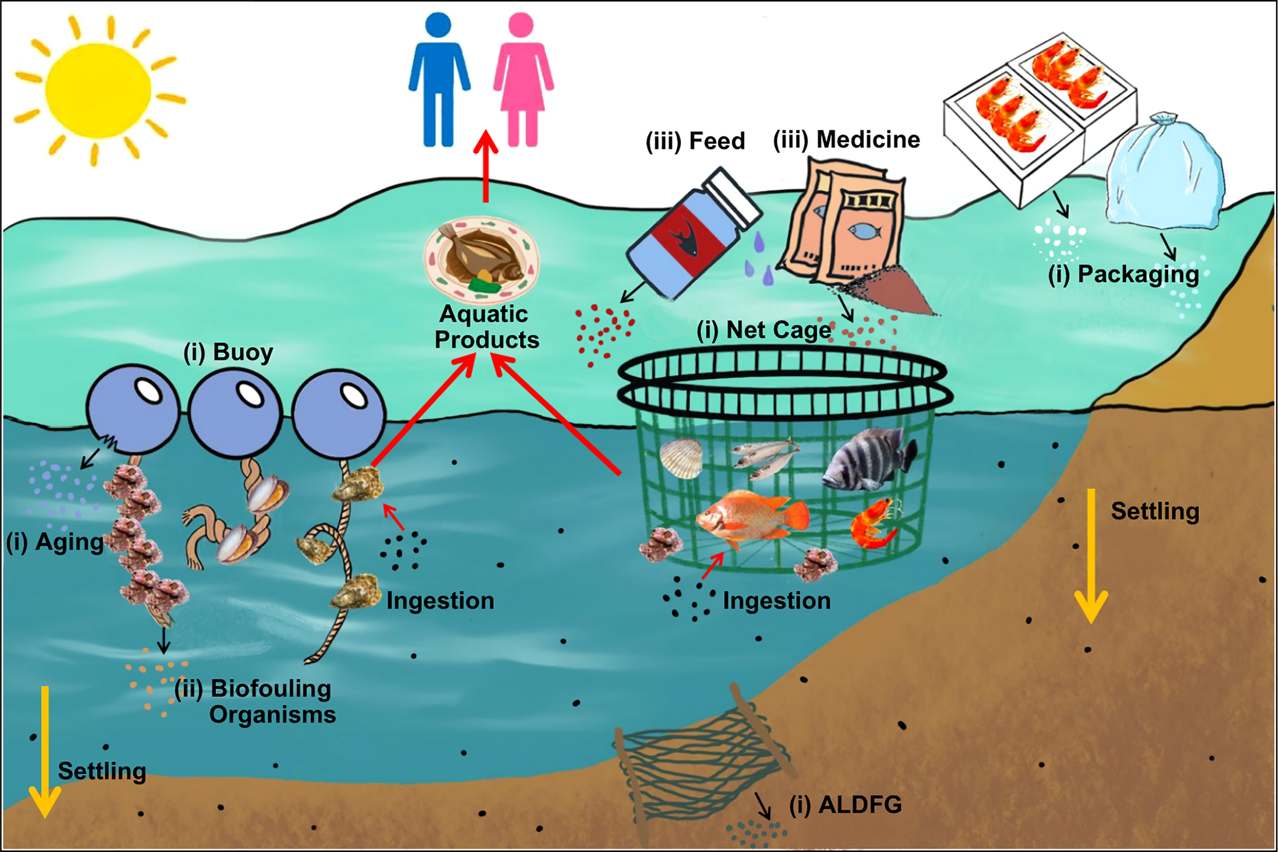 Sources of AD-MPs in aquaculture areas include several pathways (Figure 1): (i) sunlight driven decomposition, seawater corrosion, wave friction and abrasion can cause the breakdown of the plastics in use (e.g., buoys, net cages, packaging) as well as the abandoned, lost, or discarded fishing gears (ALDFGs) and form AD-MPs (Lusher et al., 2017; Chen et al., 2018); (ii) Removing biofouling organisms can lead to the release of fibrous AD-MPs from aquaculture equipment such as fishing nets and ropes (Davidson, 2012); and (iii) AD-MPs contained in the feed or adsorbed on the surface of fish medicine can enter the aquatic environment during aquaculture (Yao et al., 2021).