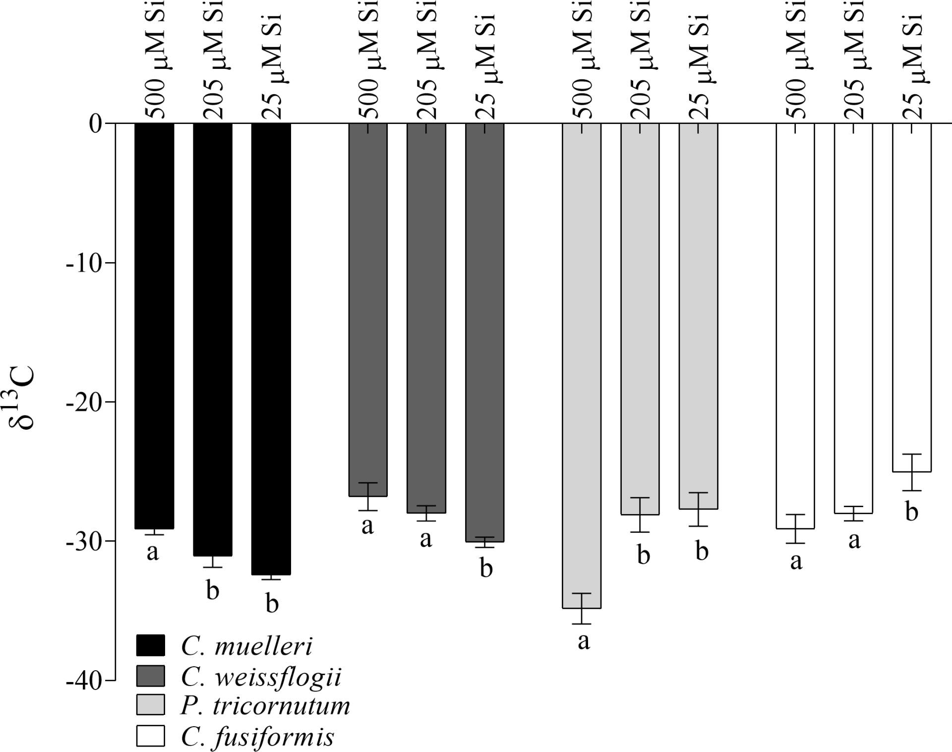 | C. fusiformis | 205 µM Si | 9.13 ± 1.09b | 1.74 ± 0.23b | 0.15 ± 0.01 | 0.11 ± 0.01 | 0.005 ± 0.001a |