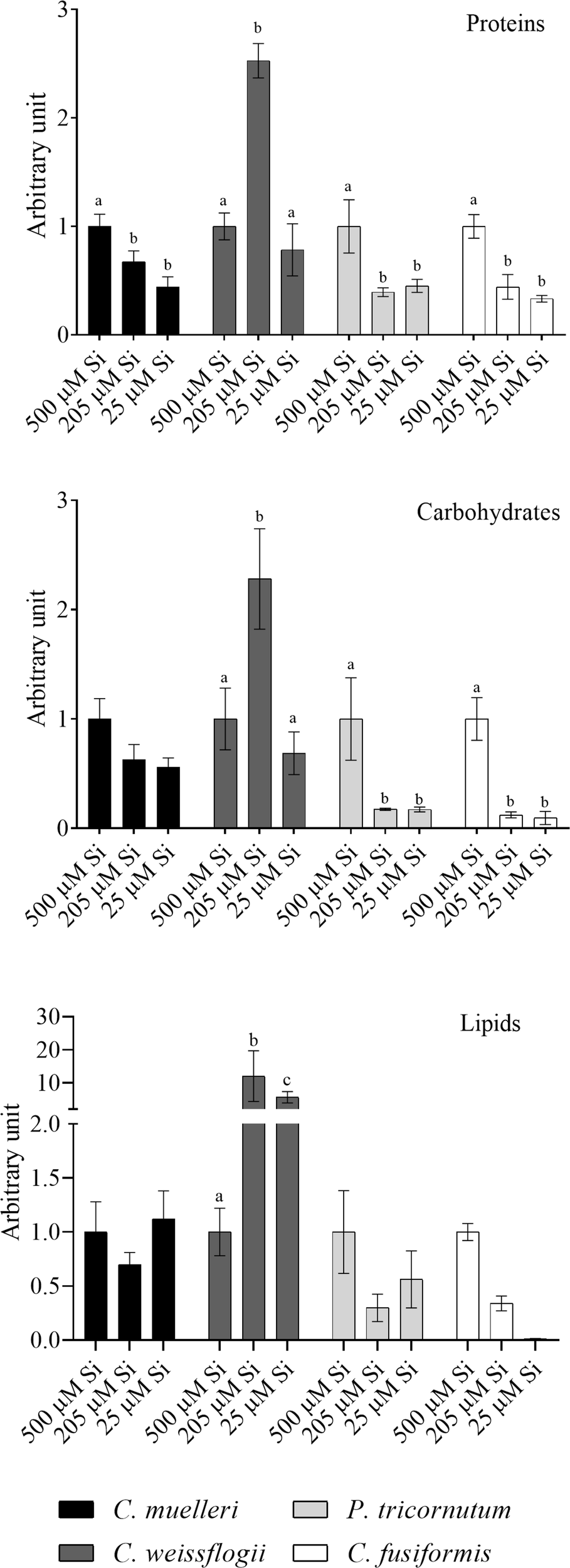 | P. tricornutum | 205 µM Si | 78.01 ± 31.42b | 11.94 ± 4.36b | 2.67 ± 0.53b | 3.01 ± 0.42b | 0.078 ± 0.013 |