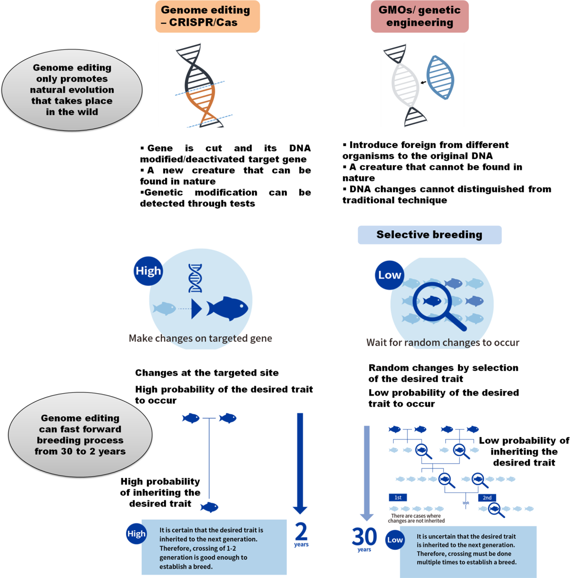 CRISPR/Cas as high-speed new breeding technology in aquaculture: CRISPR/Cas genome editing promotes natural evolution that naturally takes place in the wild and can fast forward the genetic improvement process at a high speed with minor targeted changes in the genome (Adapted from https://regional.fish/en/genome/).
