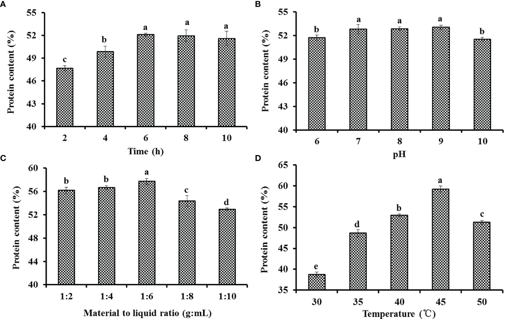 Effects of time (A), pH (B), material-to-liquid ratio (C), and temperature (D) on the protein contents of the gelatin extract solution of Siberian sturgeon cartilage. All data are expressed as mean ± SD (n = 3). Values with the same letters indicate no significant difference (P > 0.05).