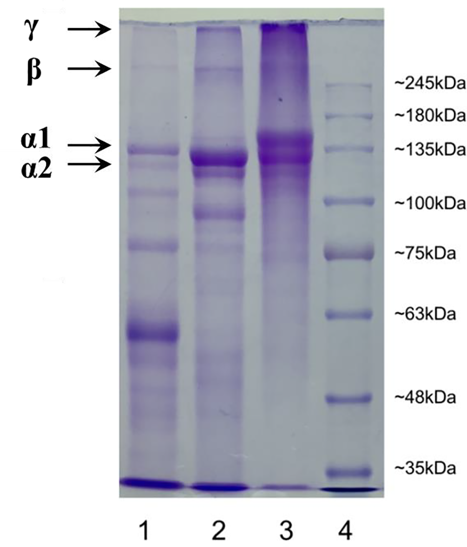 The electrophoretic pattern of TCG was measured according to a previous method using 4% stacking gel and 7.5% separating gel (Yu et al., 2014; Li et al., 2018). The MWs of the TCG components were estimated using high-MW protein markers. PSG and collagen of Siberian sturgeon cartilage were used as standards.