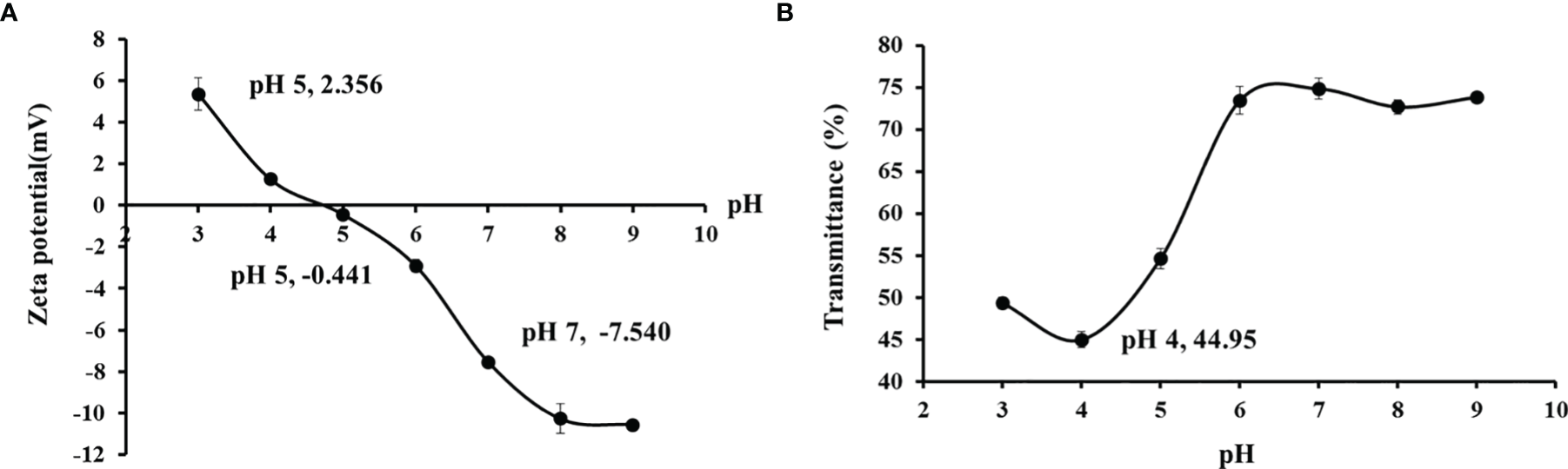 The percent transmittance of each TCG sample (1.0 mg/ml, pH 3–9) at 620 nm was measured using a UV-1800 spectrophotometer. The graph was made according to the relationship between pH and percent transmittance, in which the pH value corresponding to the lowest transmittance was the pI of gelatin.