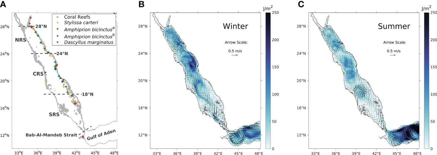 Within the basin, the annual average general circulation of the Red Sea is characterized by two vertical overturning cells in the upper and lower basins, respectively (Sofianos and Johns, 2015; Yao and Hoteit, 2018). The vast majority of coral reefs live within the upper cell (above ~150−250 m), which consists of annual average northward flow at the surface and southward flow at intermediate depths (Yao et al., 2014b; Yao et al., 2014a; Sofianos and Johns, 2015). The upper cell is also characterized by distinct seasonality and strong mesoscale eddy activities (Zhan et al., 2014; Zhan et al., 2016; Zhan et al., 2018; Zhan et al., 2019), which drive complex local circulation patterns and substantially impact physical connectivity (Raitsos et al., 2017; Wang et al., 2019). Based on circulation features, the Red Sea basin (excluding the two gulfs at the northern end) can be broadly divided into the southern Red Sea (SRS, north of the BAM strait up to approximately 18°N), the central Red Sea (CRS, approximately 18°N-24°N) and the northern Red Sea (NRS, approximately 24°N-28°N; Figure 1A). During winter (Figure 1B), surface intrusion from the Gulf of Aden intensifies along the western boundary at the southern end of the SRS and shifts toward the centre of the SRS as it propagates northward (Yao et al., 2014a). This surface northward flow then transits toward the eastern side due to the meandering currents and vigorous eddies in the CRS and changes into an eastern boundary current in the NRS, forming a cyclonic gyre north of 24°N and centred between 26°N and 27°N (Sofianos and Johns, 2003; Yao et al., 2014a; Zhai et al., 2015). In the intermediate layer of the Red Sea, there is a southward flow consisting of the high-salinity water formed during the sinking process in the NRS (Yao et al., 2014a; Papadopoulos et al., 2015; Yao and Hoteit, 2018). Meanwhile, eddies across the entire Red Sea basin intensify during winter, particularly in the CRS (Zhan et al., 2014; Zhan et al., 2016). During summer (Figure 1C), the intermediate intrusion from the Gulf of Aden propagates northward up to ~19°N-22°N (Sofianos and Johns, 2007; Churchill et al., 2014; Yao et al., 2014b). At the surface, the cyclonic gyre in the NRS weakens during summer (Yao et al., 2014b). A southward eastern boundary current driven by north-westerly winds flows from the CRS to the SRS, splits at the southern end of the basin and partly returns as a northward western boundary current (Sofianos and Johns, 2003; Sofianos and Johns, 2007; Yao et al., 2014b). The general eddy activity in the Red Sea is also weaker during summer (Zhan et al., 2016); yet an intense semi-permanent anti-cyclonic eddy centred at ~18.5°N spins up during summer in response to the lateral Tokar wind jets (Zhai and Bower, 2013; Zhan et al., 2018).