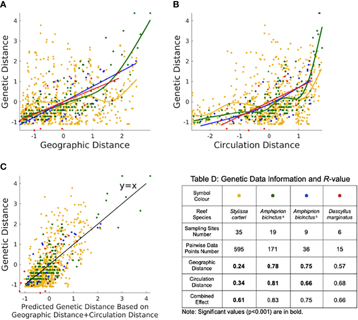 Statistical analysis using the Generalized Additive Model (GAM) for the (A) IBD theory, (B) IBC theory and (C) combined IBD with IBC. Legends for (A–C) are listed in Table (D) Genetic Data Information and R-value. The table provides information on the R values (R^2 is the coefficient of determination) for the four datasets of the reef sponge S. carteri and the reef fish A. bicinctusa, A. bicinctusb and D. marginatus. Data were standardized to a mean of zero and a standard deviation of one. Note that the black line in (C) is y = x.