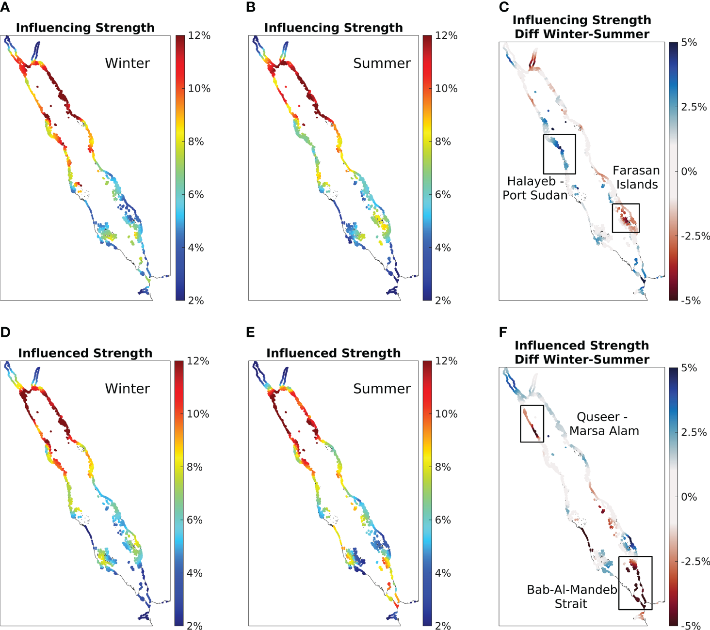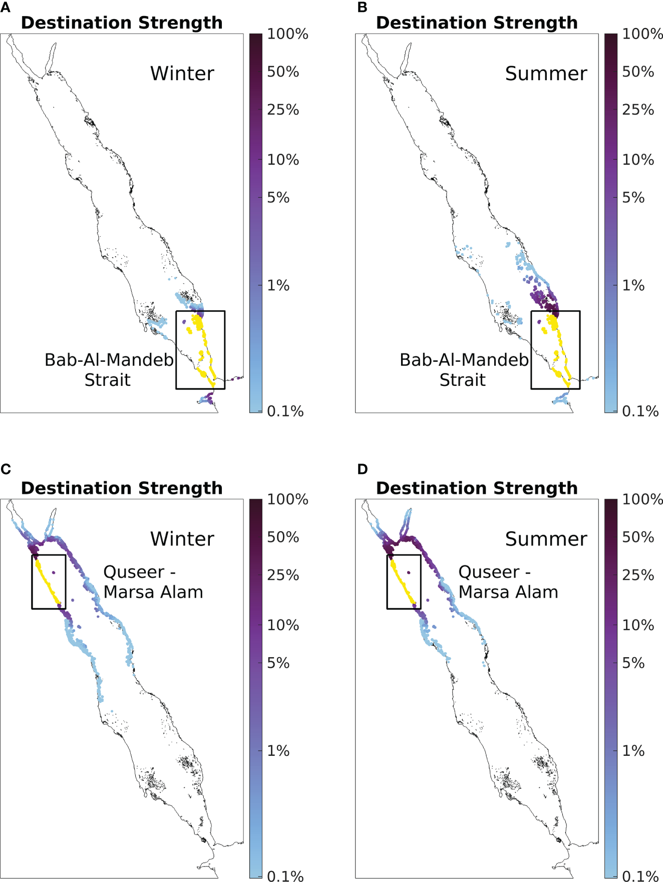 Similarly, to further examine the seasonality of influenced strength, the seasonal destination strength of the reefs in the BAM strait (located at the southern end of the SRS; Figures 6A, B) and the coastline between Quseer and Marsa Alam (located along the west coast of the NRS; Figures 6C, D) are presented as case studies.