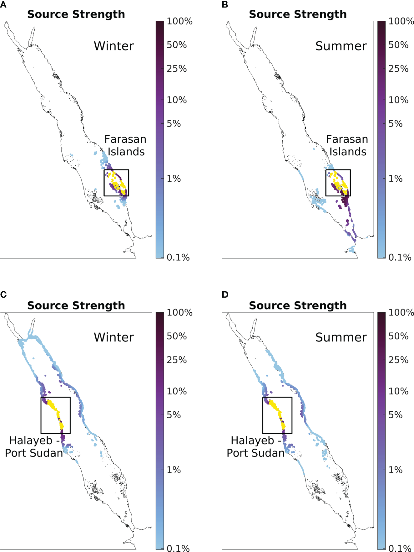 To further examine the seasonality of influencing strength, the seasonal source strength of the reefs in the Farasan Islands (located on the east coast of the SRS; Figures 5A, B) and the coastline between Halayeb and Port Sudan (located on the west coast of the CRS; Figures 5C, D) are presented as case studies.