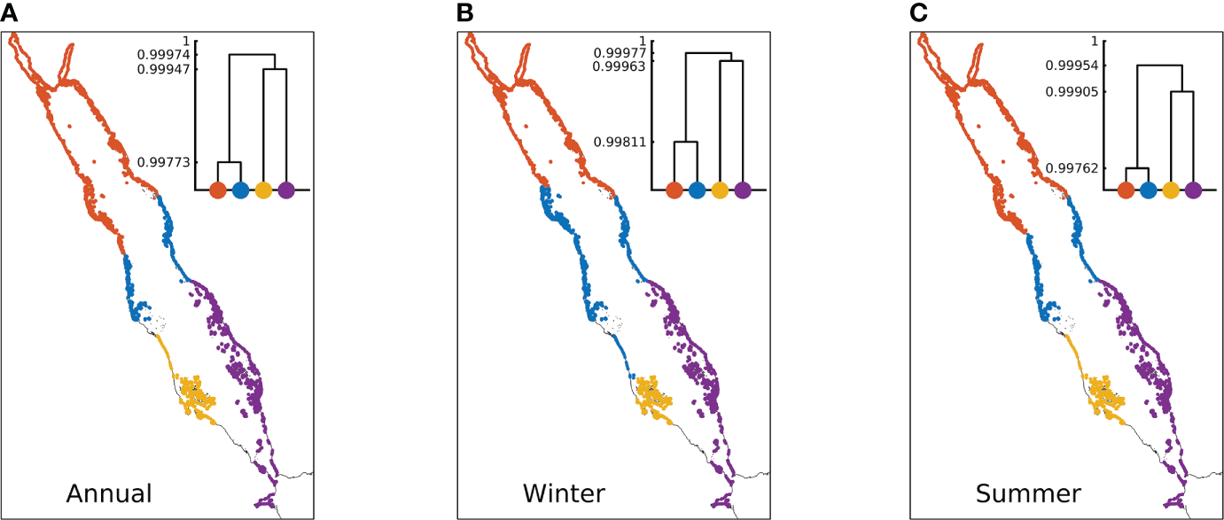 The seasonal clustering results exhibited similar patterns to the annual results (Figure 7). Compared with summer, the central basin cluster (blue) on the east coast extends towards both the north and south during winter (Figures 7B, C). The decreased height of all U-shaped lines (i.e., decreased dissimilarity) in summer revealed that the meridional exchange along the basin becomes more frequent and the weak connection between the east and west coasts of the southern Red Sea is enhanced during this season (Figures 7B, C).