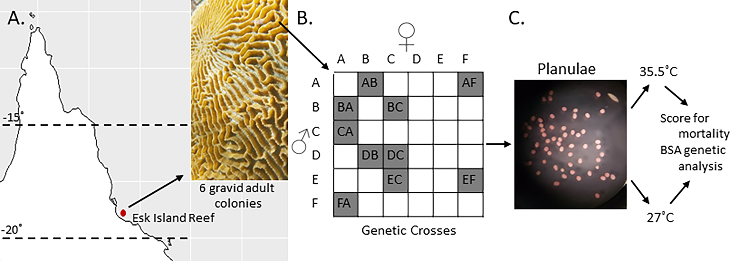Six colony fragments of Platygyra daedalea were collected from Esk Reef, an inshore reef in the central region of the Great Barrier Reef (18˚ 46’21.95” S, 146˚ 31’ 19.33” E) under Australian Institute of Marine Science (2020) permit G12/35236.1. The corals were maintained in the National Sea Simulator at AIMS at Esk Reef ambient temperature (27°C) in flow-through sea water aquaria with 25% reduced ambient sunlight. In November 2016 (the 5th night after the full moon, at 18:30) the six parental colonies were isolated in ~60L bins filled with filtered sea water (FSW) that was filtered with a 0.04µm filter (Weeriyanun et al., 2021). Colonies spawned between 18:30-19:00 GMT+10. Gamete bundles were collected and washed with FSW. Sperm and eggs were then separated using 60 µm mesh sieves and eggs were thrice rinsed to eliminate residual sperm. We combined gametes from pairs of colonies according to a partial diallel design (Figure 1) to produce 10 families (hereafter termed crosses). A full diallel cross was not possible because colonies D and E did not produce enough eggs for the purposes of this experiment. Each cross was maintained at a density of 0.5 to 1.0 planula larvae per ml in separate 12L culture vessels with flow-through FSW at 27°C and gentle aeration.