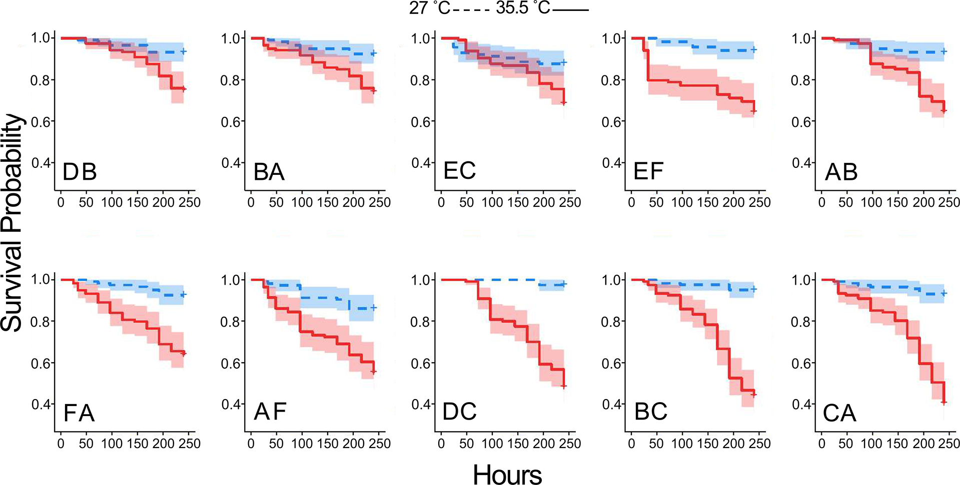 Heat tolerance differs among crosses. Kaplan Meier plots of cumulative probability of survival for each family in control 27.5°C (blue) and elevated 35.5°C (red) temperature. Panels are arranged in order of heat tolerance, based on survival probability at 240 hr. Shaded regions represent 95% confidence intervals.