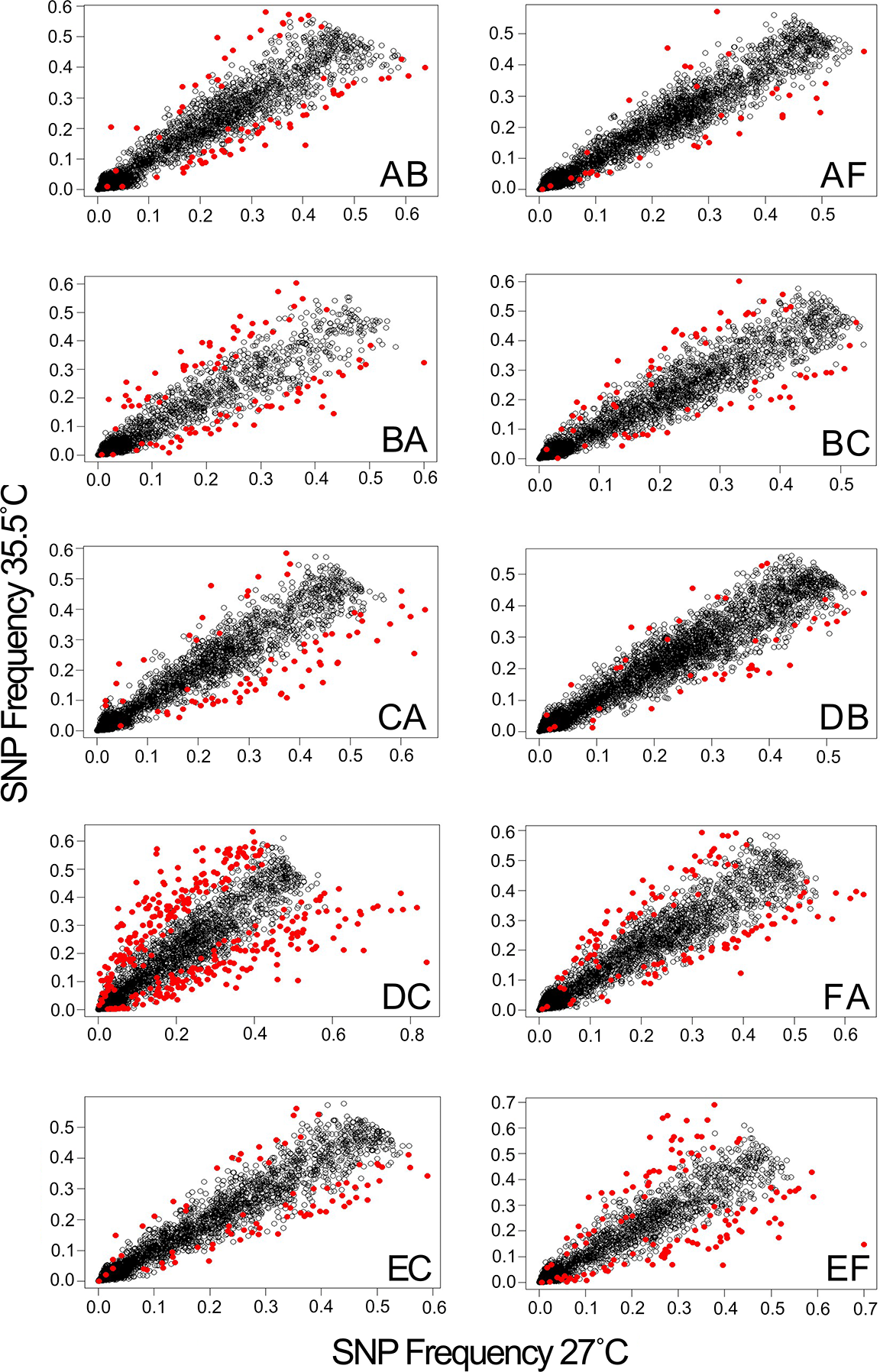 Heat stress alters allele frequencies in surviving larvae. Panels show correlations between the average allele frequencies in survivors of replicate heat stress treatments relative to the corresponding controls. Markers with significantly altered allele frequencies (logistic regression, FDR < 0.05) are highlighted in red.