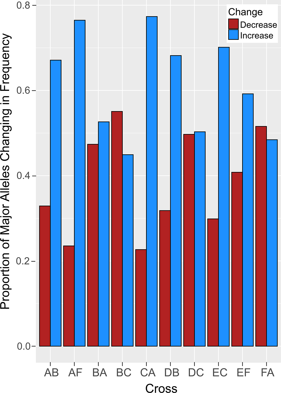 The proportion of major alleles that changed in frequency after heat stress. Crosses are indicated on the x-axis and the proportions of major alleles that increased (blue) and decreased (red) are depicted on the y-axis.