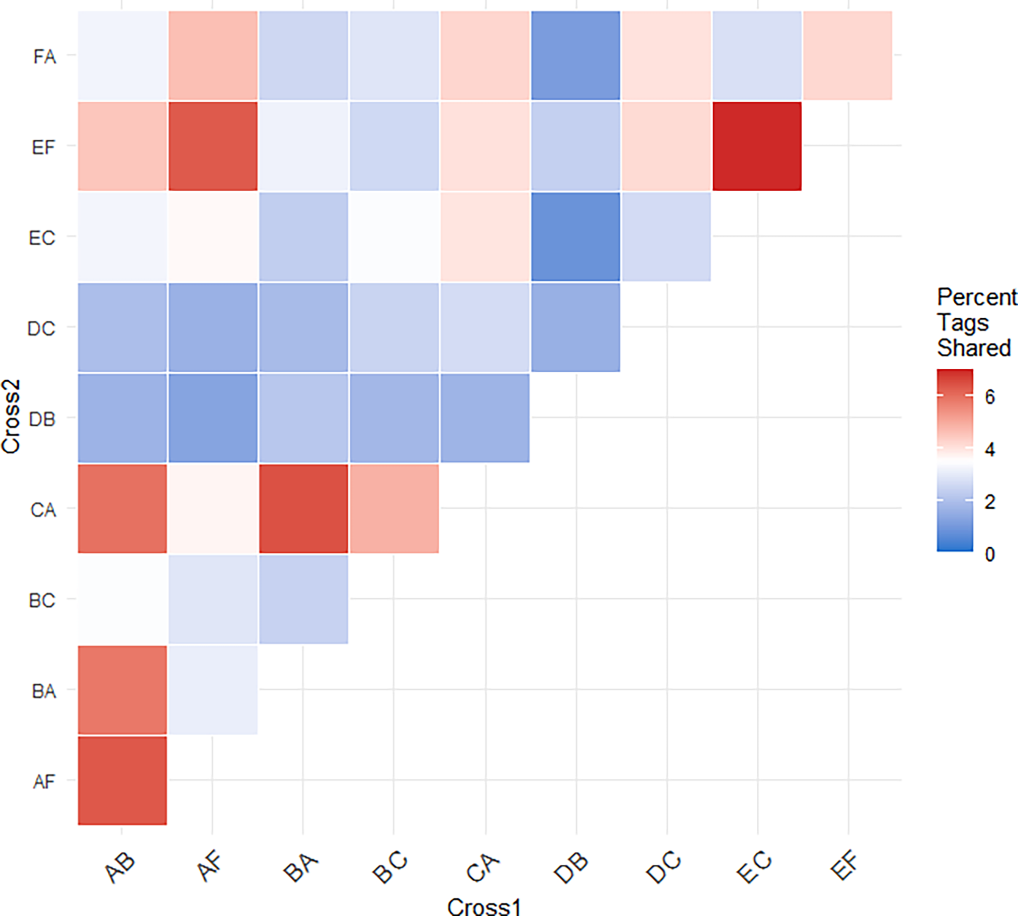 We then examined the presence and absence of SNPs between all pairwise combinations of crosses. To determine if the difference in significant SNPs identified between crosses was the result of filtering and genotyping steps, we calculated the percentage of tags missing in all crosses. Tidyverse and dplyr R software packages were used to extract the number of tags before and after all the filtering steps, and at the 80x coverage threshold and to compare those to all tags genotyped in each cross (Wickham et al., 2019; Wickham et al., 2020). To calculate the percentage of tags shared between each pair of crosses we compared the total significant tags genotyped in one cross to the sum of the significant tags genotyped in each focal pair. We also found whether significant tags were found to be insignificant or not genotyped in each cross. For tags with overlap in four or more crosses, we determined whether the allele in the cross was increasing or decreasing in frequency.