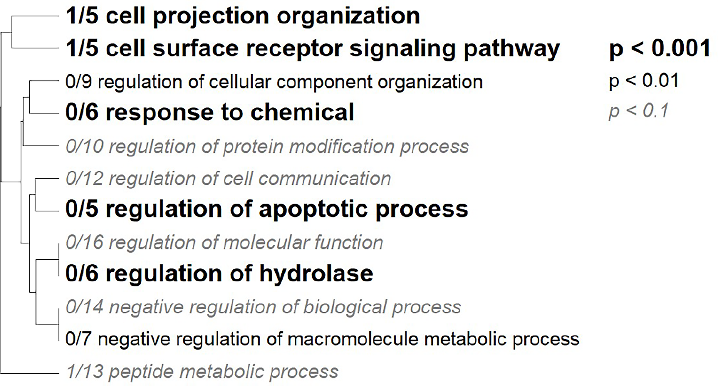 To investigate the functional implications of candidate tolerance loci, we mapped the 2bRAD reference (SRA accession: SRP066627, Howells et al., 2016) to the P. daedalea transcriptome (SRA accession: PRJNA403854, Kirk et al., 2018) using Bowtie2 (Langmead et al., 2009) requiring a minimum MAPQ score of 23. Gene names and ontology terms were assigned to mapped 2bRAD tags based on the existing transcriptome annotations (Kirk et al., 2018). For tags that were identified in the transcriptome, we determined if the allele in the tag was increasing or decreasing in frequency. A rank-based gene ontology (GO) enrichment analysis was conducted to identify significantly enriched terms among annotated tags containing significant SNPs as identified in the allele frequency analysis using the GO_MWU suite of scripts (Wright et al., 2015) https://github.com/z0on/GO_MWU). The p-value from the allele frequency analysis was negative log-transformed and used as the continuous variable to identify GO terms enriched among the most significant SNPs using a Mann Whitney U test followed by Benjamini-Hochberg false discovery rate correction.