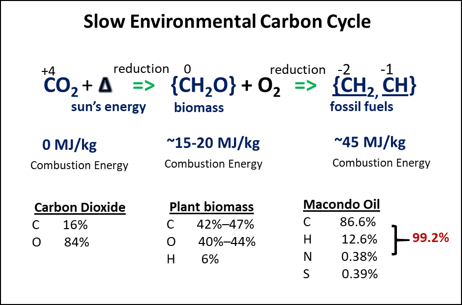 An overview of molecular transitions that occur over geological timescales during the Slow Environmental Carbon Cycle. Carbon dioxide in the atmosphere and seawater is converted to living organisms by photosynthesis. The C, H and O ratio content of this biomass is ~CH2O. When a small portion of the biomass is preserved and buried in deep reservoirs over many millions of years, this material is converted to a liquid hydrocarbon fluid with average molecular ratio of CH1.75 (mostly saturate compounds with a smaller proportion of aromatic compounds) based on C and H percent compositions. The heats of combustion (combustion energy) for typical biomass and crude oils show how much energy is stored in the C and H bonds of these two fuels.