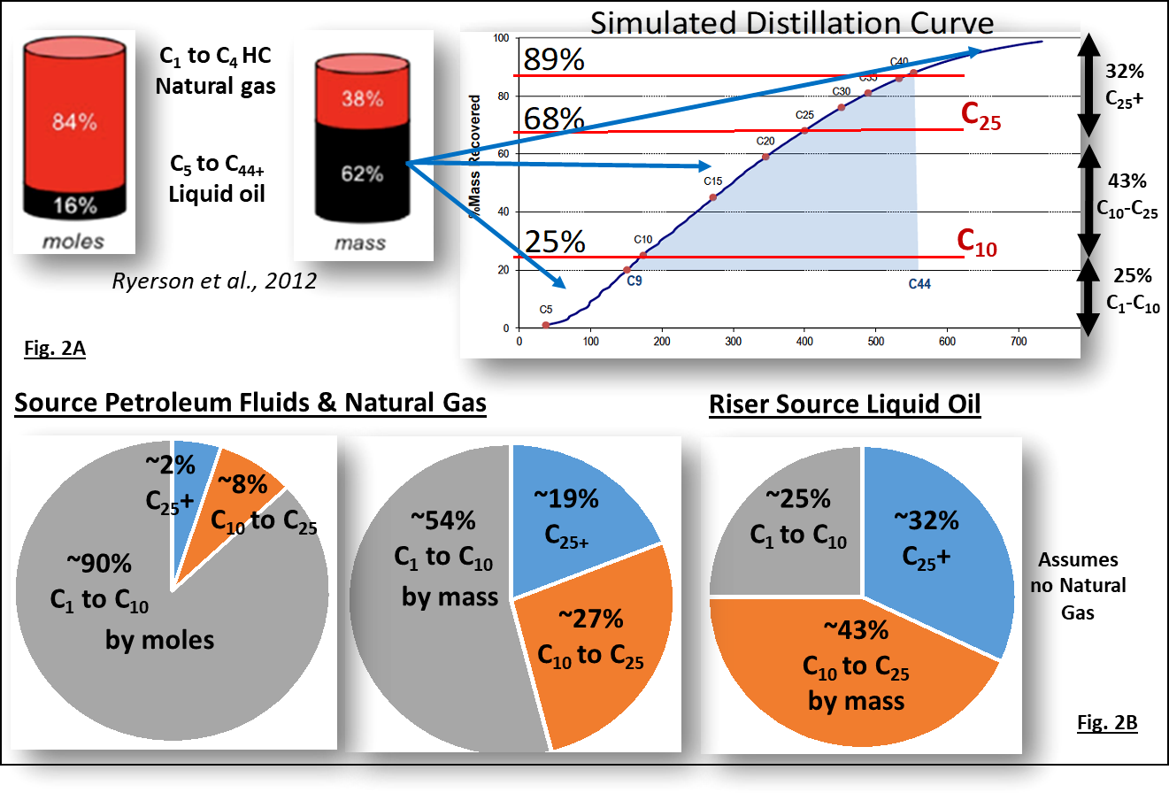 Figure 2 outlines the relative compositions of the three fate fractions in the Macondo oil that entered the environment (i.e., the source petroleum fluids from the Macondo well blowout). This source Macondo oil contained compounds that are a gas at ambient temperature and atmospheric pressure, the C1 to C4+ natural gas hydrocarbons, as well as the liquid oil that was collected from the broken riser pipe. The riser source liquid oil reflects liquid oil from the Macondo reservoir. The fate fractions in Figure 2 are based on their molar and mass compositions, as calculated from the carbon number simulated distillation curves of the liquid riser oil from Macondo well, provided by Aeppli et al. (2018). The source oil is commonly known as a “live oil” because it is mixed with natural gas (the C1 to C4+ hydrocarbon compounds). The riser liquid oil, collected in open containers that allowed evaporation of the natural gas, is commonly known as a “dead oil” because most of its very volatile C1 to C4+ components (the natural gas compounds) have evaporated.