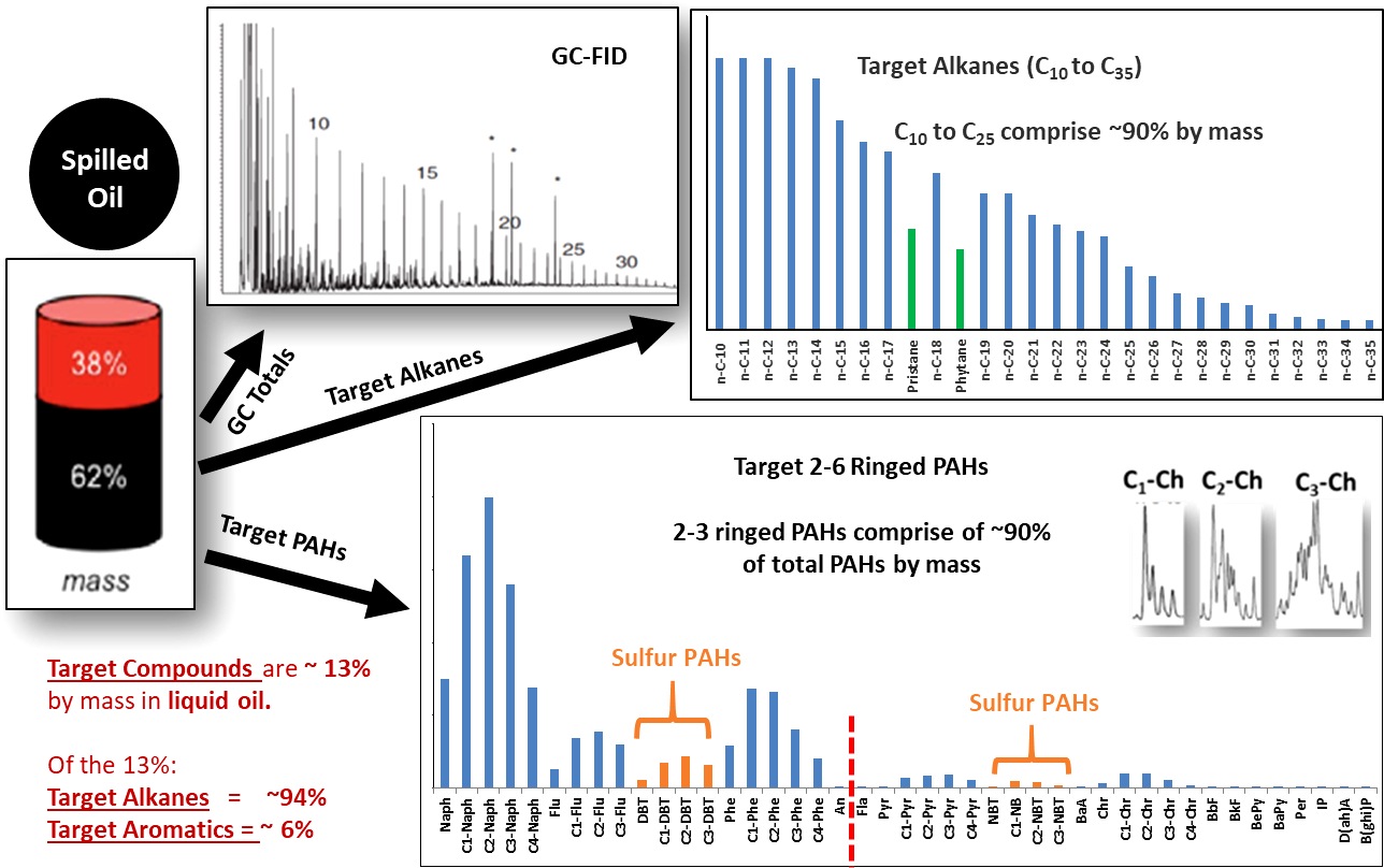 Since crude oil is such a complex mixture of thousands of compounds, scientists have traditionally used a select, relatively small number of representative hydrocarbon compounds as analytical targets, including a suite of alkanes, PAHs, and forensic biomarkers, when studying crude oil spills and oil weathering. These target compounds have been selected based on their high individual concentrations in typical oil, as well as their known capacity to cause harm during environmental exposures (i.e., acute and/or chronic toxicities). The target alkane compounds, analyzed by GC and GC-MS type analytical methods, include normal alkanes up to n-C35 or n-C40, as well as the isoprenoids (branched alkanes) pristane (C19H40) and phytane (C20H22). Target aromatics include two to six ringed PAH compounds and their respective C1 to C3 or C4 alkyl homologs, and includes the sulfur containing benzo, dibenzo and naphthyl-benzo thiophenes and their respective alkyl homologs. Forensic biomarkers are the hopane and sterane type molecules in oils that were present in the source biomass material and whose chemical structures is maintained in the reservoir’s crude oil composition, thus enabling source-spill correlations, and the identification of spilled oil and its residues in the environment. See Table 1 for target compound identifications and their GC-MS quantitative ions.