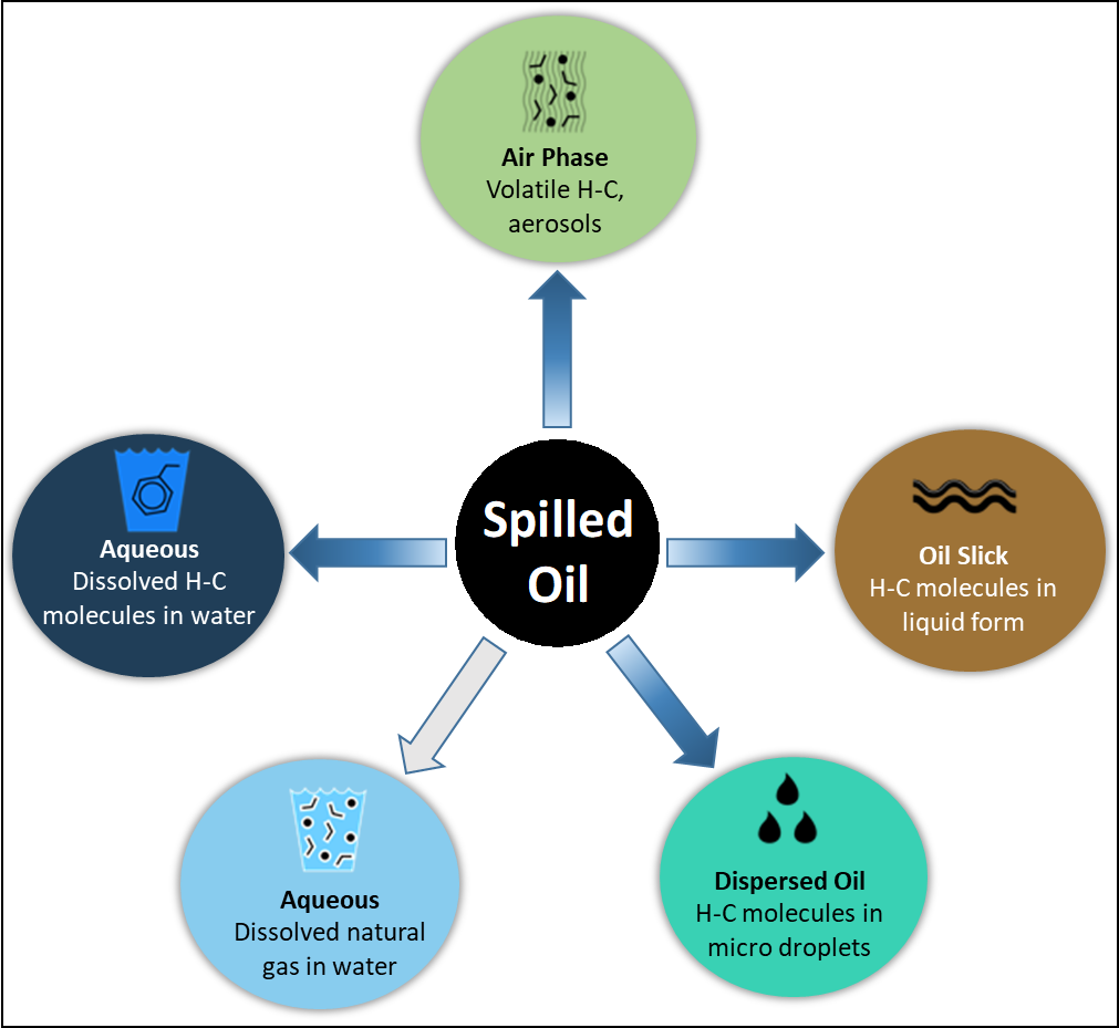 Outline of the phases that are immediately encountered when oil spills into the environment. The circumstances of the spill (source, source composition, location, depth, weather, containing hydrocarbon molecules, etc.) will determine which phases will initially predominate. However, when oil is spilled, its hydrocarbons components are immediately distributed between these phases, and environmental weathering proceeds from the starting point of hydrocarbons in these phases.
