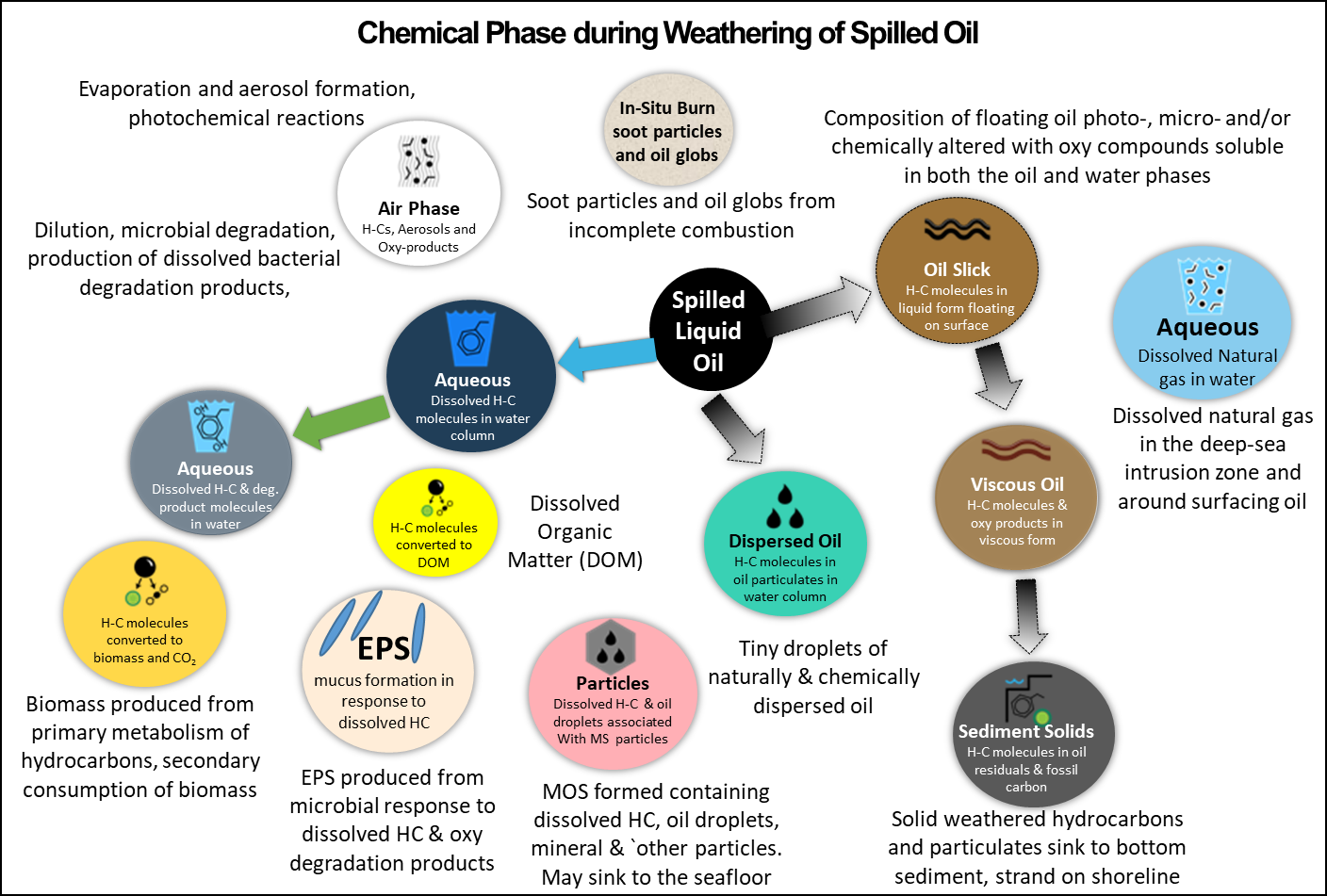 The initial chemical composition of spilled crude oil will have important implications for its near- and far-field transport as well as on its weathering. Understanding, the weathering processes on the spilled oil’s chemical composition involves multiple scientific disciplines with each discipline focusing on different aspects of weathering. Using the 2010 DwH oil spill as a case study, we have developed diagrams that outline the movement (into the air, water, soils, sediments, marine and mineral particles, and biota) and transformations (i.e., microbial and photooxidation) involved in the oil’s composition during weathering. To aid in understanding the fates of oil spilled into the ocean, these movements, phases, and transformation processes are outlined in Figures 5, 6.