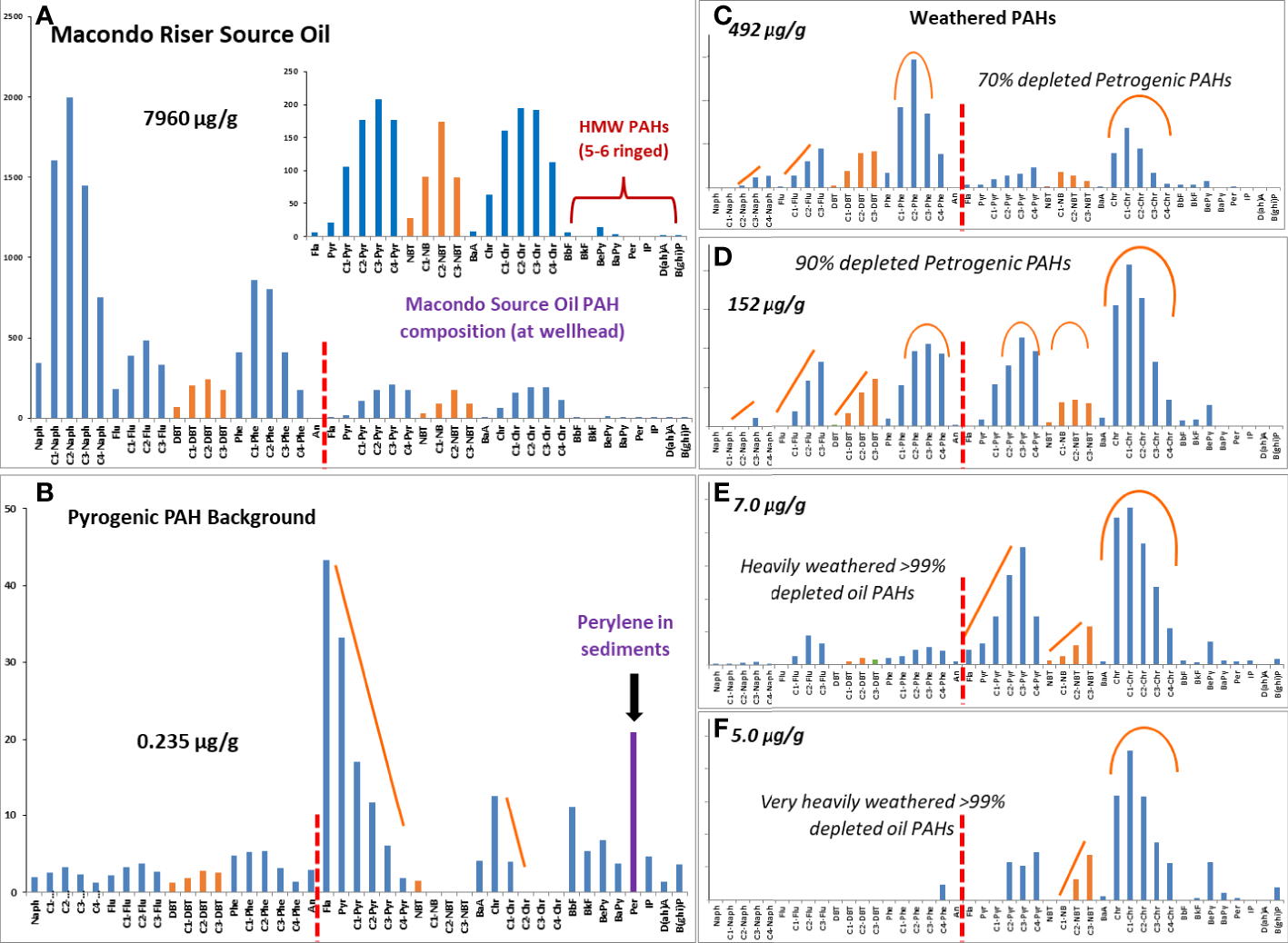 Of the target compounds identified in Figure 4, the target alkanes were by far the most abundant, and accounted for 94% of all target compounds in unweathered Macondo well oil. These alkanes represent about 12% of the weight of the initial liquid oil. The two to six ringed PAH compounds and their alkyl homologs plus the dibenzo and naphthyl benzo thiophenes and their alkyl homologs, identified as target aromatic compounds in Table 1, account for ~6% of this target compound composition. This means that ~2% of the weight in the fresh un-weathered Macondo oil was from the target aromatic compounds. In essence, scientists use analytical methods that quantitate ~13% of fresh liquid oil’s specific hydrocarbons to follow how the whole composition of spilled oil’s hydrocarbons changes during environmental weathering.