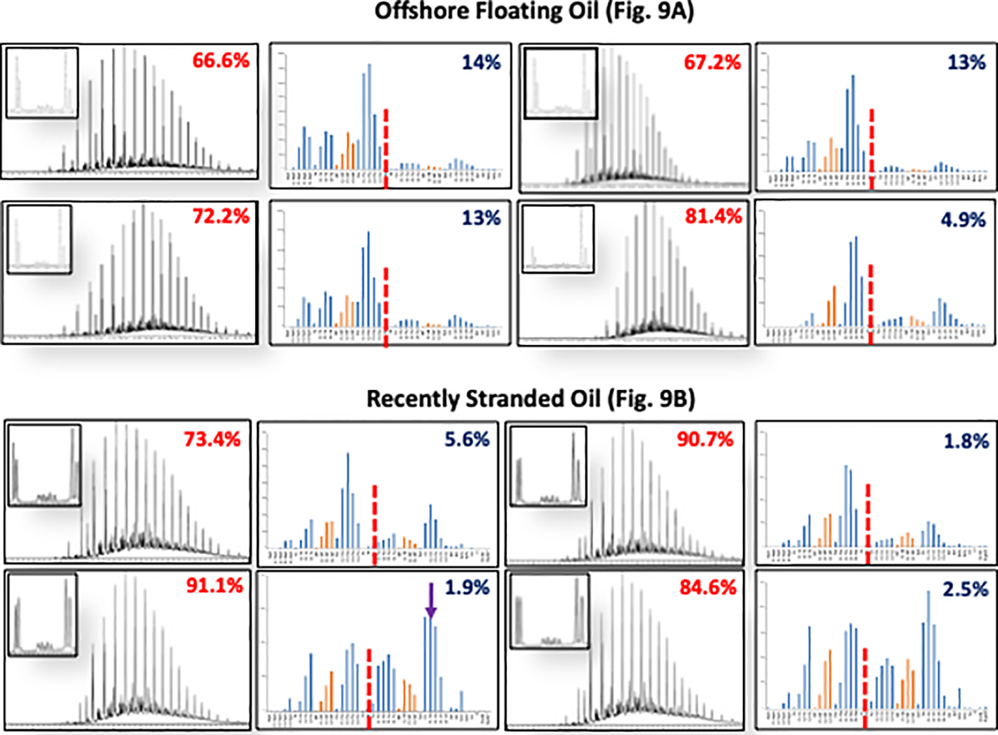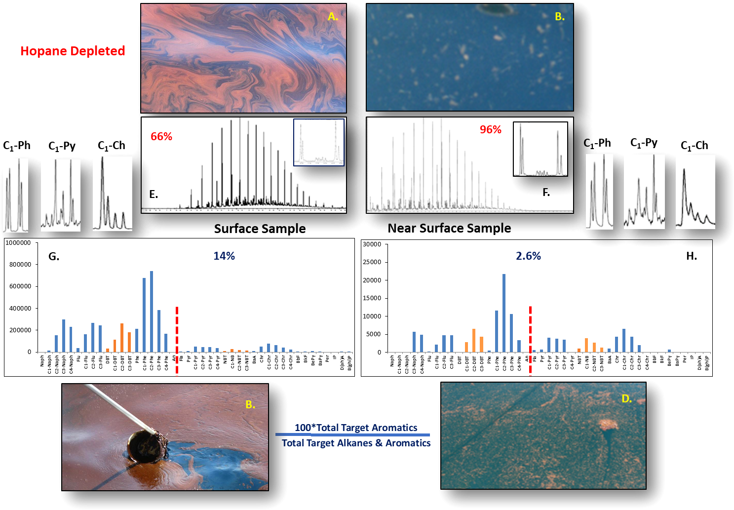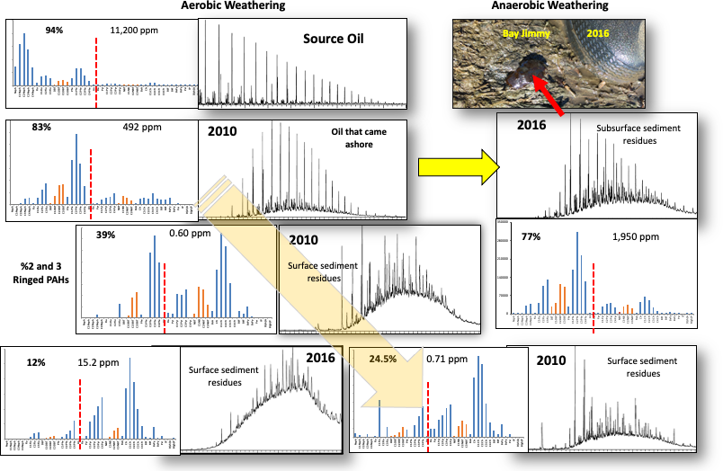 It is important to point out that photochemical weathering of floating crude oils will produce large oil-soluble oxy hydrocarbons that are operationally described as asphaltenes, i.e., they are insoluble in light alkane solvents but soluble in more polar organic solvents like toluene. These oxidized hydrocarbons are not chemically identical to native crude oil asphaltenes, as they have a high oxygen content (Ruddy et al., 2014). However, these photochemically produced oxy hydrocarbons became a major component of the recalcitrant C25+ fraction in solid residues lingering from spilled oil weathering. Further, these oxy hydrocarbons are not detectable using traditional GC-MS analytical methods. However, they are detectable using complementary methods, most notably, ultrahigh-resolution mass spectrometry, in crude oil and crude oil residues (Aeppli et al., 2012; Ruddy et al., 2014; Wise, et al., 2022).
