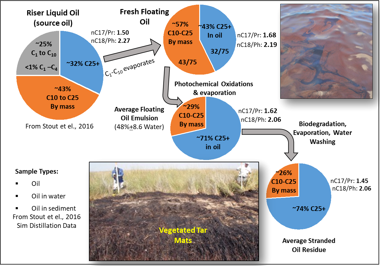 The environmental fates of the different hydrocarbon compounds that make up crude oils are determined by a complicated series of transport and transformation processes that are collectively known as weathering (Payne et al., 1984; Payne and McNabb, 1984; Mackay and McAuliffe, 1988; Tarr et al., 2016; Passow and Overton, 2021; Farrington et al., 2021; French-McCay et al., 2021). The term fate is typically used to discuss both the spatial distribution and transport of spilled material in the environment as well as the compositional changes of crude oil on the molecular level as the oil is transformed. Removal and transformation processes occur in hours to days depending upon the spilled material and conditions during the early part of the release (Radovic et al., 2021; Farrington 2014; Tarr et al., 2016; Farrington et al., 2021). Evaporation transfers large amounts of light volatile hydrocarbons to the atmosphere, and small amounts of fresh whole oil can be atomized thus producing aerosol particles in the atmosphere (Li et al., 2017).