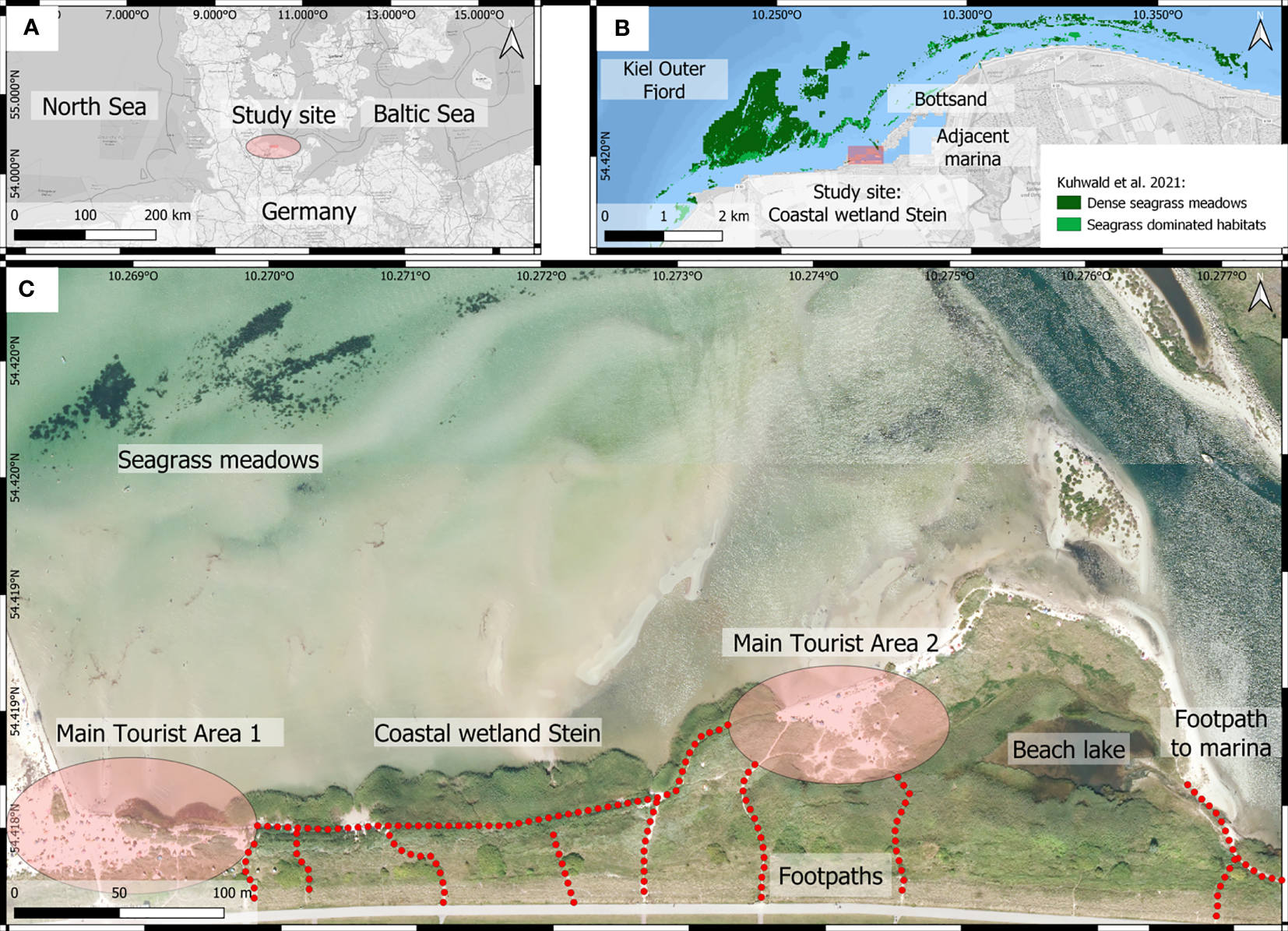 (A) The coastal wetland Stein is situated in northern Germany at the outer Kiel Fjord, Baltic Sea (Background map: Open Street Map). (B) Large seagrass meadows are located north-west of the study site (Data is derived from Sentinel satellite and cut off at 4 m water depth, provided by Kuhwald et al. (2021). Adjacent to the coastal wetland is the spit formation Bottsand, a nature protection area, as well as a marina. (C) Several footpaths cross the coastal wetland at Stein. The main footpath connects the tourist areas from east to west (The aerial image from 2019 was chosen as background image as it was taken during summer, showing the main tourist areas, data provided by the State Office for Surveying and Geoinformation Schleswig-Holstein).