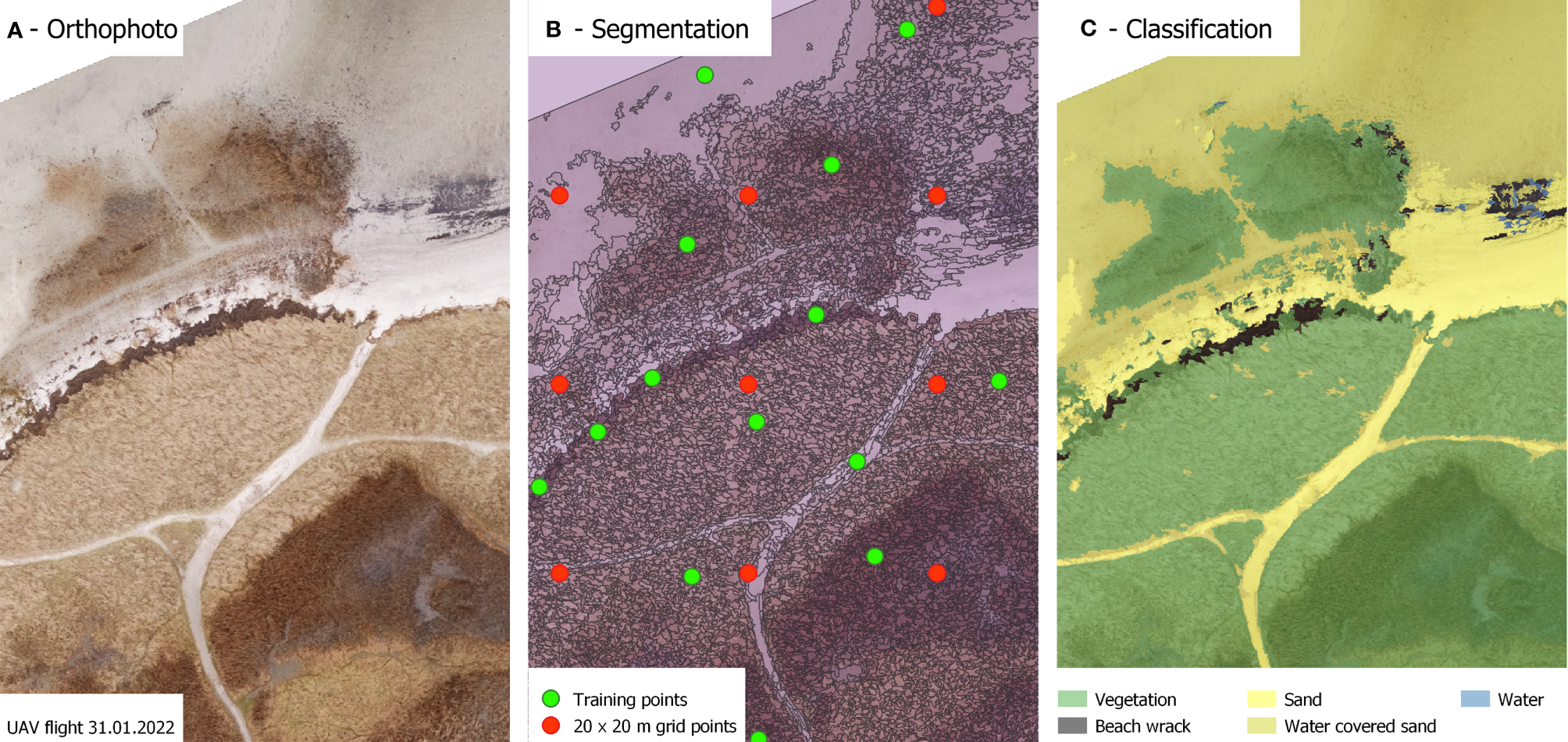 Data from UAV overflight in 70 m height. (A) Orthophoto showing unvegetated and vegetated beach with some beach wrack in the transition zone. (B) OTB segmentation results including training points for 5 classes as well as 20 × 20 m regular square grid of points for accuracy assessment. (C) Final classification results.
