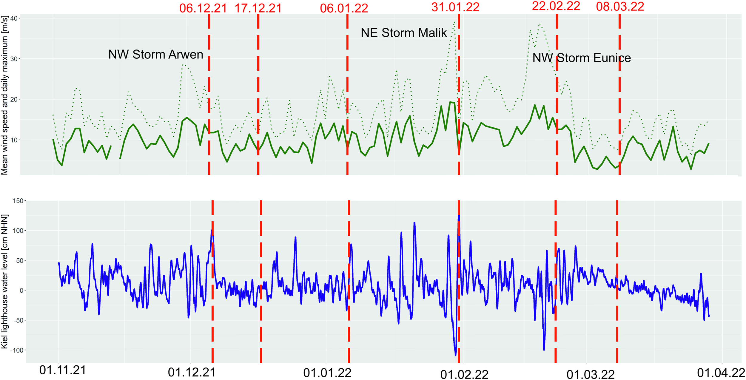 Weather data for the monitoring period was provided by the German Weather Service (DWD) and water level at the nearest station (Kiel lighthouse) was recorded by the Federal Waterways and Shipping Administration (WSV) and provided by the Federal Institute for Hydrology (BfG). Major events were storm Arwen (known as Hannelore in Germany), storm Malik (known as Nadia in Germany), and storm Eunice (known as Zeynep in Germany, see Figure 3). Storms Malik and Eunice caused serious damage in Europe with wind speeds of up to 141 km/h in Kiel.