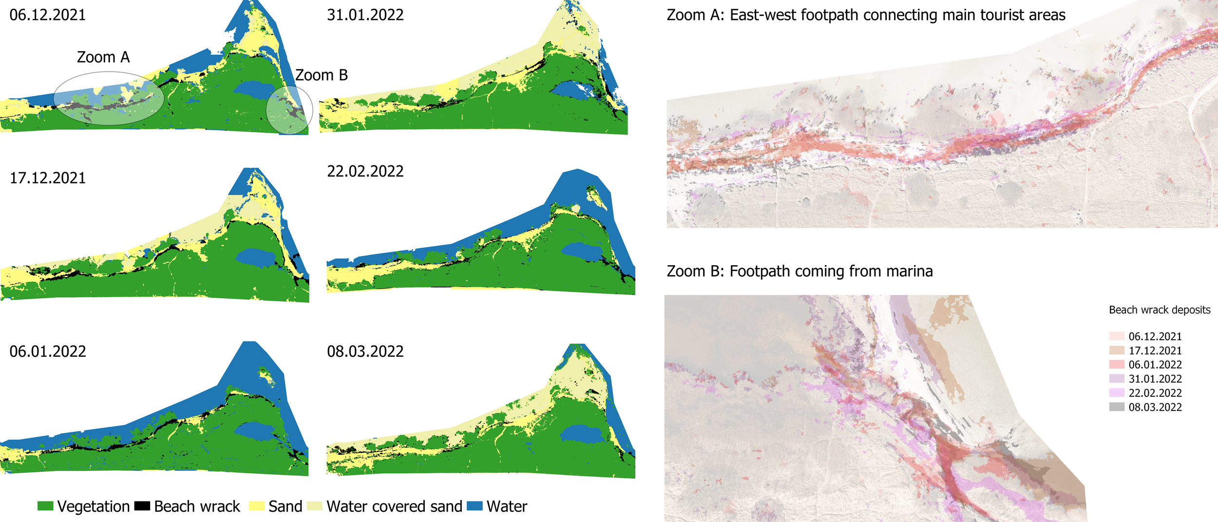 Classification results for the UAV imagery from December 2021 to April 2022. Regardless of weather or water level conditions, beach wrack accumulations could always be mapped in two hotspot areas: along the east-west footpath connecting the main tourist areas (Zoom A) and within the area between the beach lake outlet and the footpath coming from the marina in the east (Zoom B).