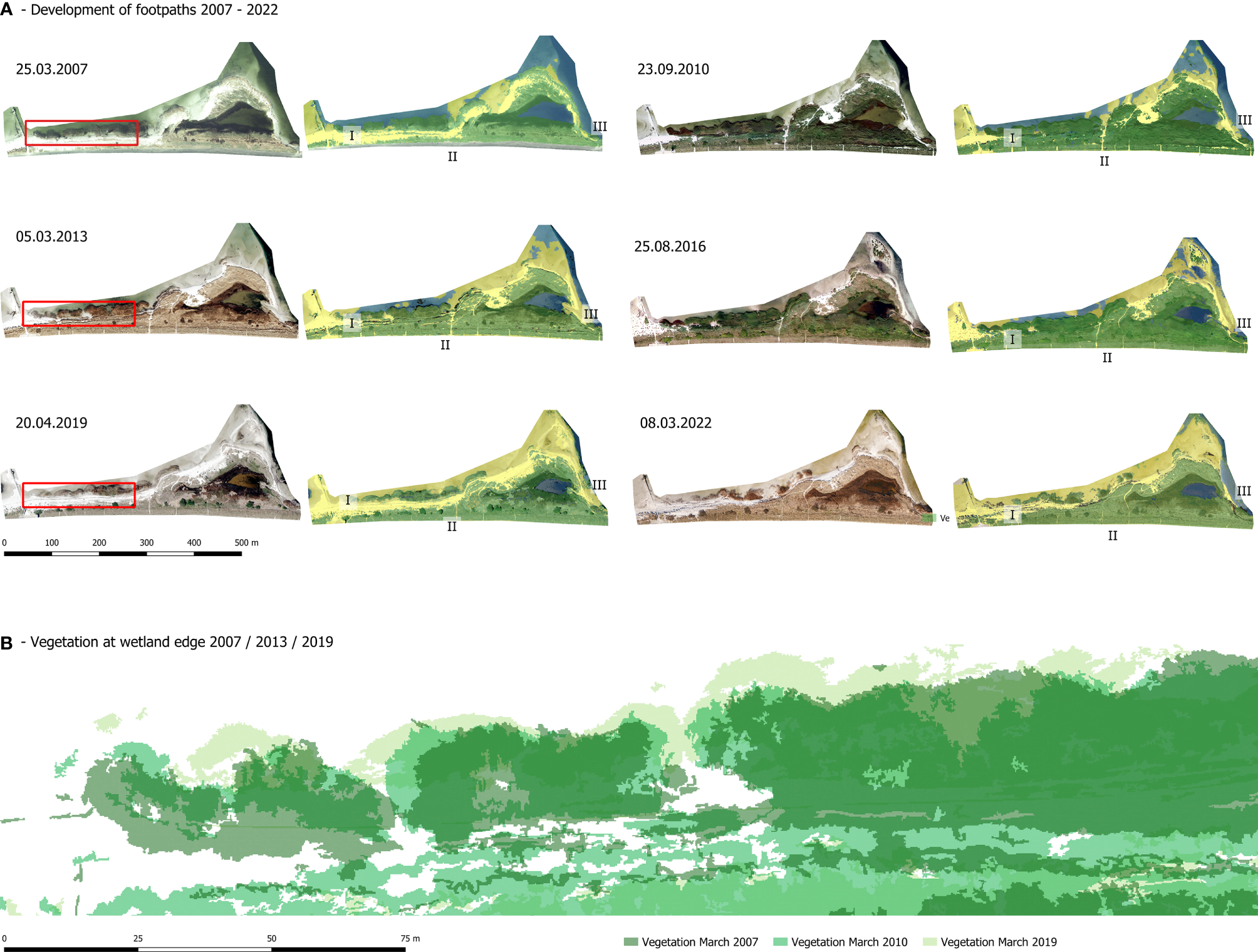 (A) Coastal wetland dynamic between 2007 and 2022. Classification results of the aerial images show that the positions of footpaths remained stable, whereas the widths varied. Locations I–III where the widths of the footpaths were measured are shown in the map. (B) Zoom into the wetland edge for March 2007, March 2013, and March 2019. The picture section is marked in red in (A). Aerial mages from 2007 to 2019 were provided by the State Office for Surveying and Geoinformation Schleswig-Holstein (LVermGeo SH).