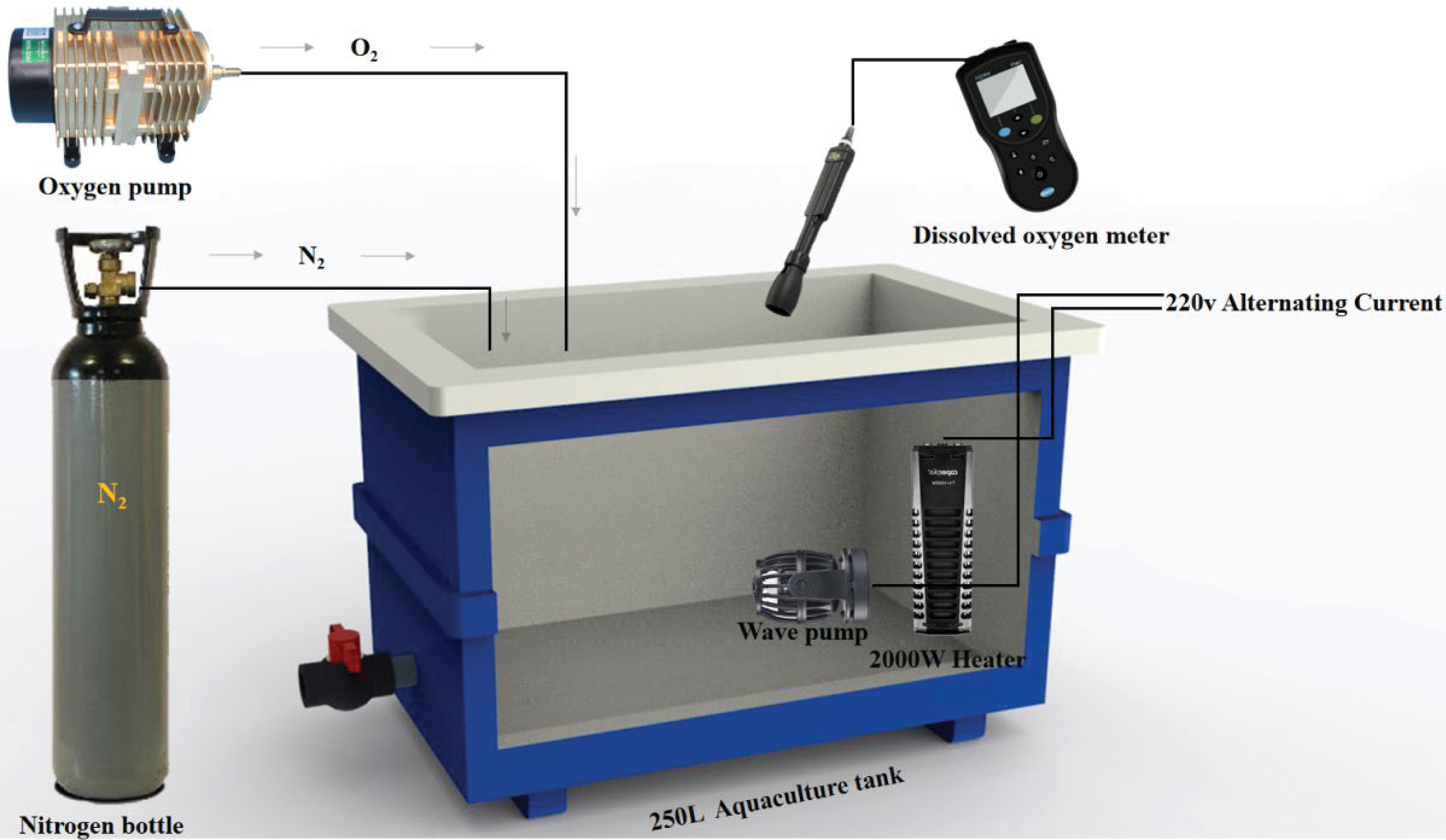 According to the changes in temperature and dissolved oxygen in the Yellow Sea and the Bohai Sea in the past ten years (Song et al., 2020) and previous experiments (Hao et al., 2022), this study selected 25°C and 2 mg/L oxygen as the conditions of temperature and hypoxia stress. Healthy S. intermedius were randomly cultured in high temperature (HT group, 25 °C, 8 mg/L O2), low oxygen (LO group, 15 °C, 2 mg/L O2), combined stress of heat and hypoxia (HL group, 25 °C, 2 mg/L O2) and control group (NC group, 15 °C, 8 mg/L O2), using 6 S. intermedius per group. The stress experiment was carried out in the automatic temperature control system and the dissolved oxygen control system (Figure 1). The temperature control system’s temperature deviation was less than 0.5 °C, and the oxygen concentration deviation of the dissolved oxygen control system was less than 0.5 mg/L (Huo et al., 2018). Previous experiments showed that individuals died at 12 hours of combined stress, and transcriptome sequencing revealed significant changes in genes related to sea urchin immunity and metabolism at 12 hours of acute stress (Hao et al., 2022). Therefore, we selected 12 h as the time of stress. After 12 h, 6 sea urchins in each group were dissected on ice to absorb the coelomic fluid and centrifuged at 3000 rpm for 10 min at 4 °C. The coelomocyte of S. intermedius were collected and immediately stored in an -80 °C for further experiments.