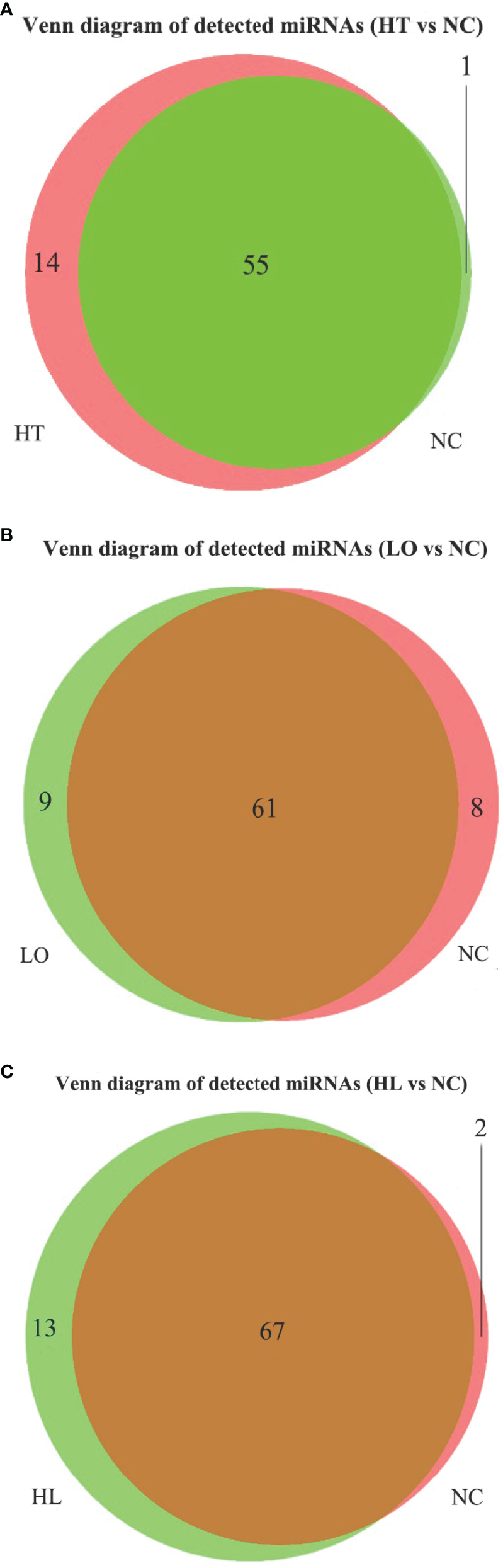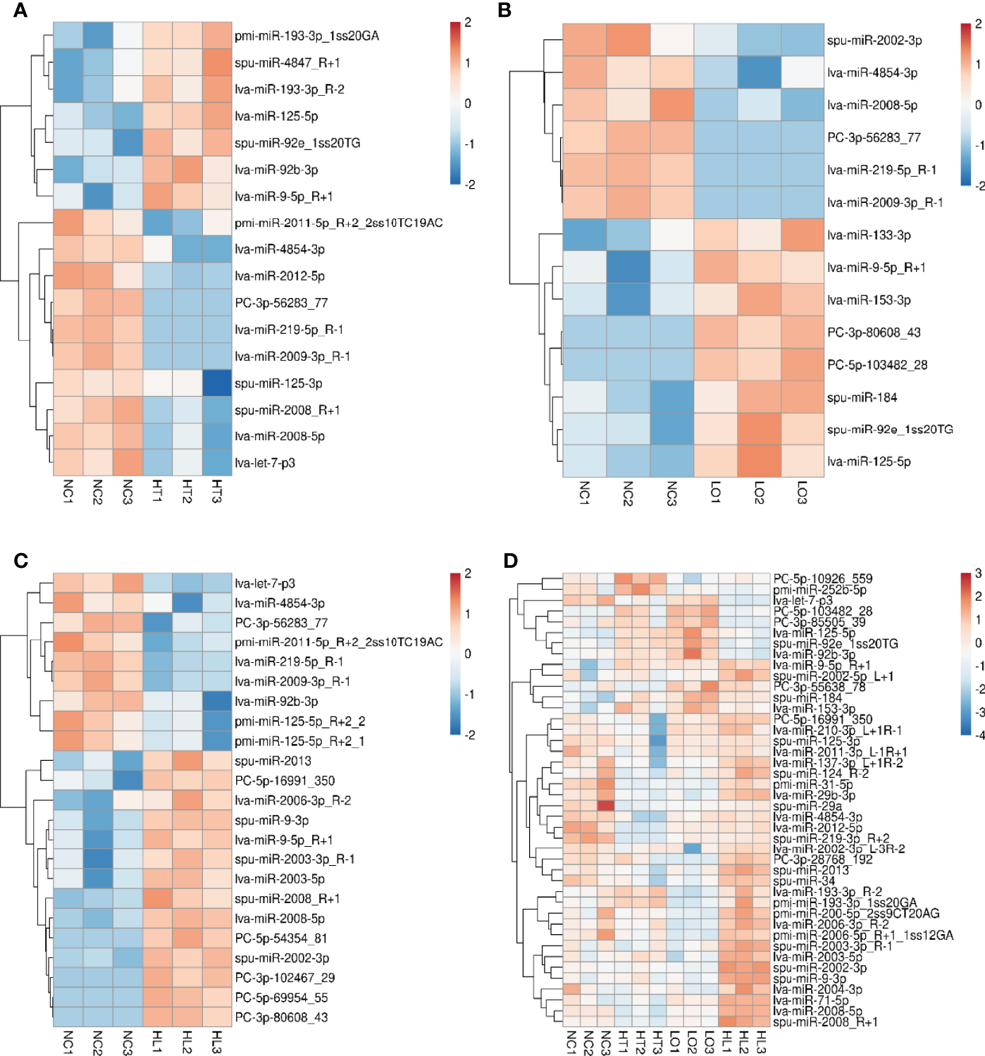 To identify DEMs between treatment group (HT, LO, and HL) and control group (NC), the expression levels of miRNAs in the whole library were normalized, and then DEMs were screened using Student’s T-test. P<0.05 was considered significant. A heatmap was constructed using TBtools and clustered by row scale. Target genes of miRNAs were predicated by using Target Finder (http://www.targetfinder.org) and were subjected to the enrichment analysis of functions and pathways by GO and KEGG database (P-value<0.05).