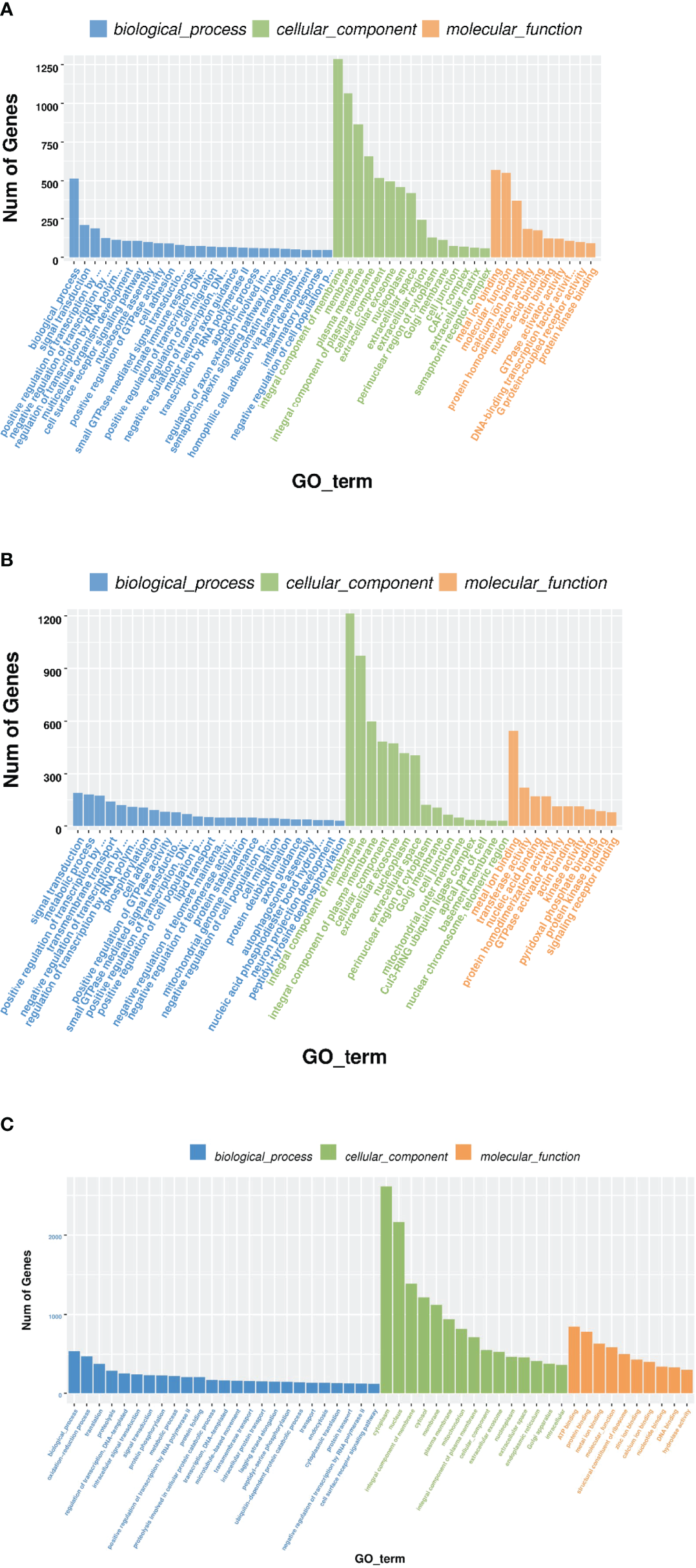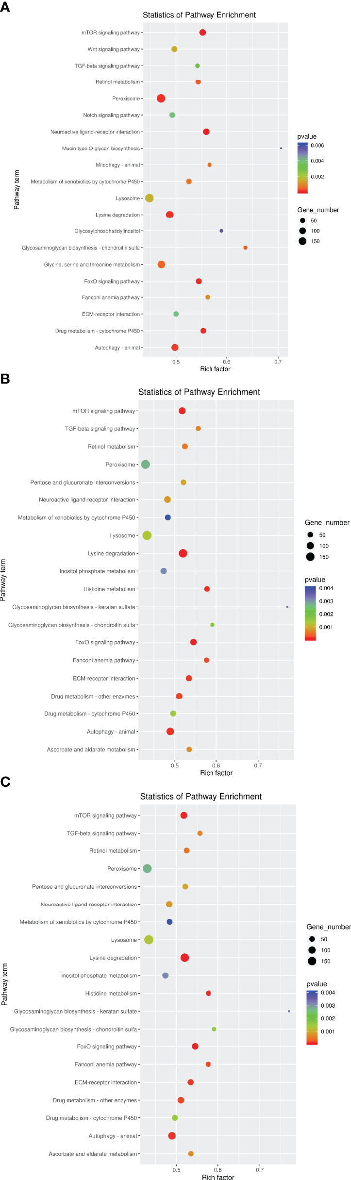 To validate the results of RNA-seq, DEMs and target DEGs were randomly selected for real-time fluorescence quantitative PCR (qRT-PCR). Total RNA extraction and reverse transcription were performed by referring to Han et al. (Han et al., 2021). 18s rRNA and U6 RNA were used as internal reference gene for qRT-PCR, which was conducted with the LightCycler96 Real-time System (Roch, Switzerland) and followed by the manufacturer’s instructions of the FastStart Essential DNA Green Master (Roch, Switzerland). The PCR primers were designed and synthesized by Shanghai Sangon Biotech and the primer sequences are shown in Table 1. The qRT-PCR was performed in a 20 μL reaction sample containing 2 μL of cDNA, 10 μL of FastStart Essential DNA Green Master, 6 μL of ddH2O water, and 1 μL (10 mM) of each primer. The reaction conditions were followed by 40 cycles of 95°C for 30 s, 95°C for 5 s, 60°C for 32 s, 95°C for 15 s, 60°C for 60 s, 95°C for 15 s and 60°C for 15 s. Compared with the control gene, fold-change of expression levers was determined using the 2−ΔΔCT method (Livak and Schmittgen, 2001), both in miRNA and mRNA PCR amplification. Statistical analysis was performed using SPSS software version 19.0 (IBM, Armonk, NY, USA). The data are expressed as the mean ± standard error of the mean (SEM) (n=3). In the results of gene expressions, significant differences (P<0.05) for each variable were first detected using the one-way ANOVA test between different groups, followed by Tukey’s HSD test.