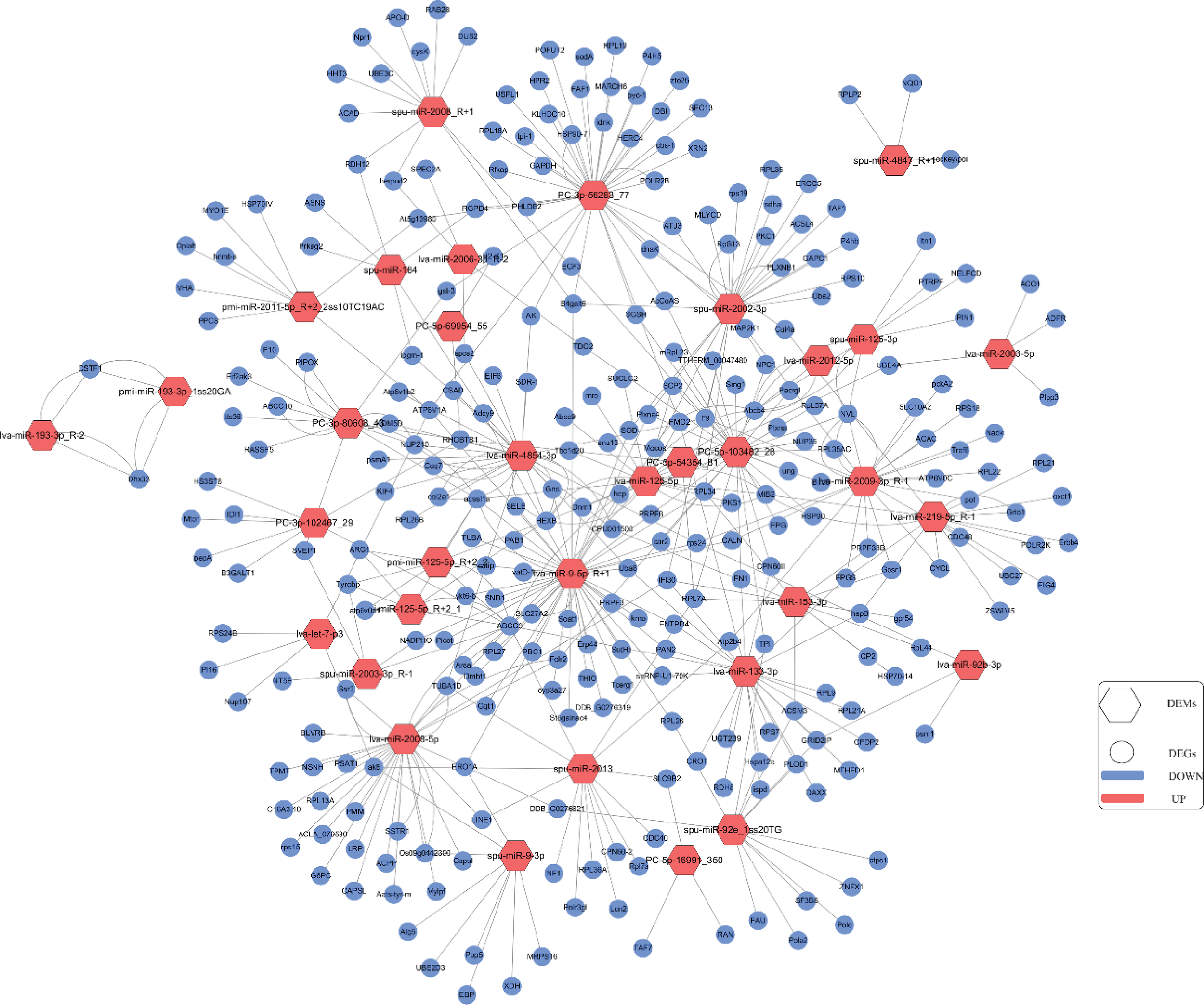 Association analysis of DEM and differentially expressed genes (DEGs) were based on published transcriptome data (Database number: PRJNA776993). All possible positively and negatively correlated miRNA-mRNA pairs were predicted using ACGT101-CORR1.1. Based on the comprehensive analysis of DEGs and DEMs, we screened the negatively associated miRNA-mRNA pairs and constructed interaction networks using Cytoscape 2.8.3 software (http://www.cytoscape.org/).