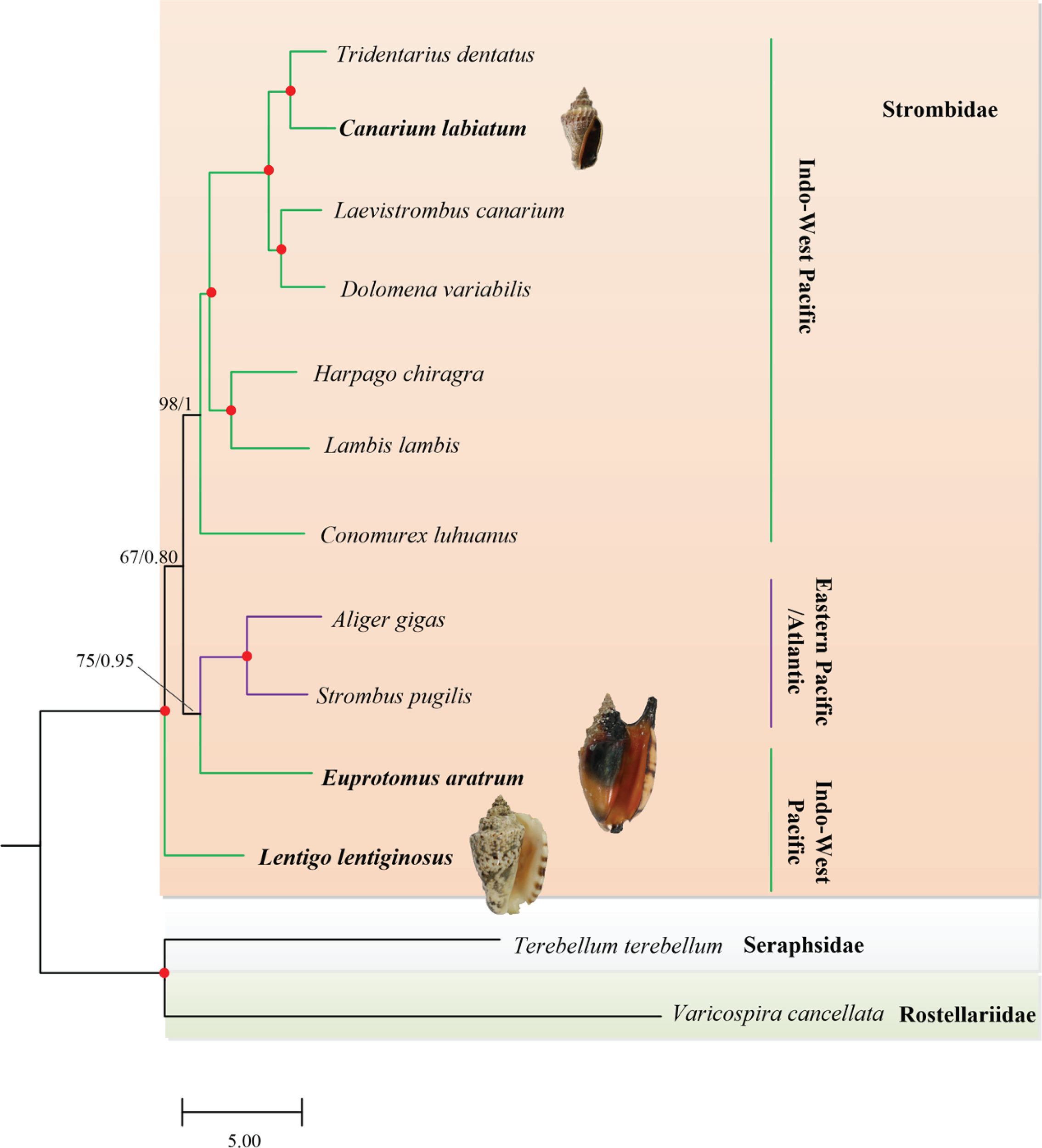 The traditional classification divided Strombidae into several genera, within which Strombus and Lambis were the two most species-rich groups (Abbott, 1960; Abbott, 1961). Although Strombus and Lambis differ greatly in shell morphology, they possess similar characteristics of soft tissue anatomies, egg masses, and radulae (Abbott, 1961). The subsequent morphological (Stone, 2001) and molecular (Latiolais et al., 2006) analyses revealed the non-monophyly of either Strombus or Lambis and called for further revision of Strombidae taxonomy, which relied on a robust phylogenetic framework.