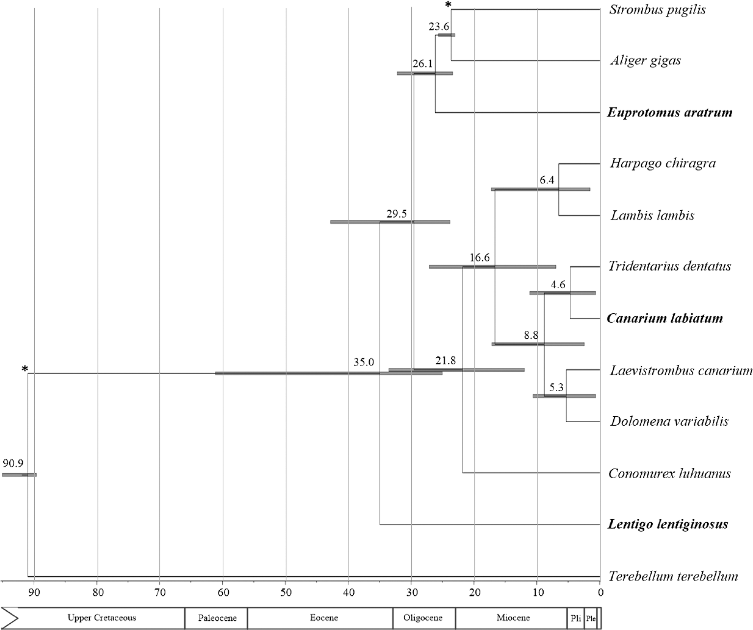The posterior distribution of the estimated divergence times was obtained by specifying two calibration points that were based on fossil records as priors for divergence times of the corresponding splits. The first calibration point was set at the origin of Strombidae. A lognormal distribution was applied, with a minimum of 89.8 Mya and a 95% upper limit of 100.5 Mya (offset, 89.8; mean, 2.5; SD, 2.8) based on the probable ancestor of strombids evolved during the Cenomanian-Turonian epoch (Roy, 1996). A second calibration point was set for the divergence of Strombus and Aliger, with a minimum of 23.0 Mya and a 95% upper limit of 28.5 Mya (exponential distribution; offset, 23.0; mean, 1.5) based on the proposed pre-Miocene common ancestry between the two groups (Machkour-M’Rabet et al., 2021).