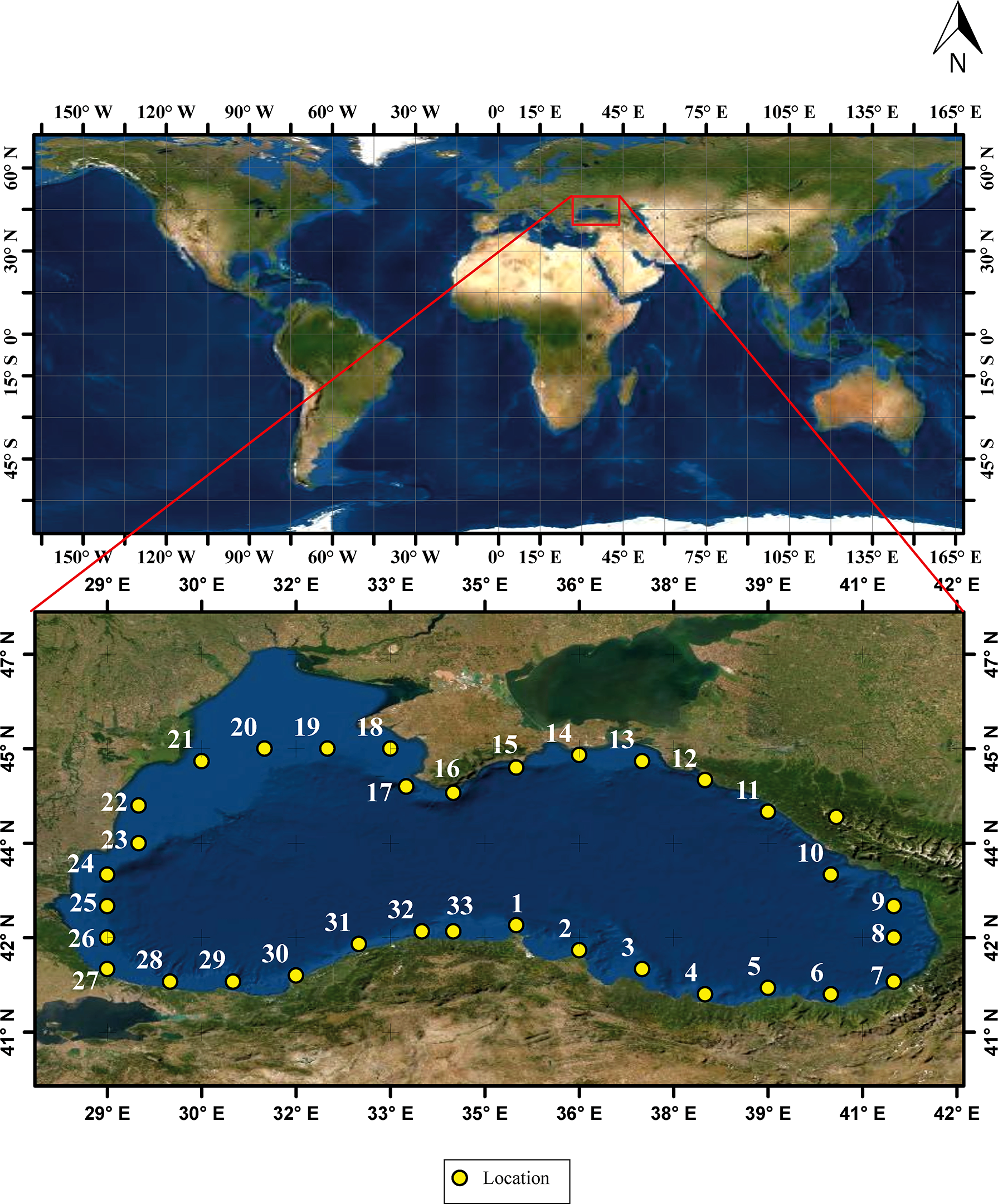 The deep-water basin, which covers most of the sea, and the coastal shelf are two morphological aspects of the Black Sea. The shelf band in the northwestern section of the sea stretches up to 200 kilometers broad. A 20-kilometer-long continental slope and shelf differentiate the southern and eastern shores. With a maximum depth of 2212 meters, the center part of the Black Sea basin is a relatively flat plain. The depths off the coasts of Crimea and the Caucasus are steadily rising, reaching 500 meters just a few kilometers from the shore (Divinsky and Kosyan, 2020). Thirty-three locations along these coastal regions of the Black Sea were determined within the scope of the study by taking a degree difference between longitudes. Of these 33 locations, nine are in the southeast (1-9), seven in the northeast (10-16), eight in the northwest (17-24), and nine in the southwest (25-33) of the Black Sea. The positions of these locations are shown in Figure 1. Detailed information about the study area and locations can be found in Akpınar and Bingölbali (2016).