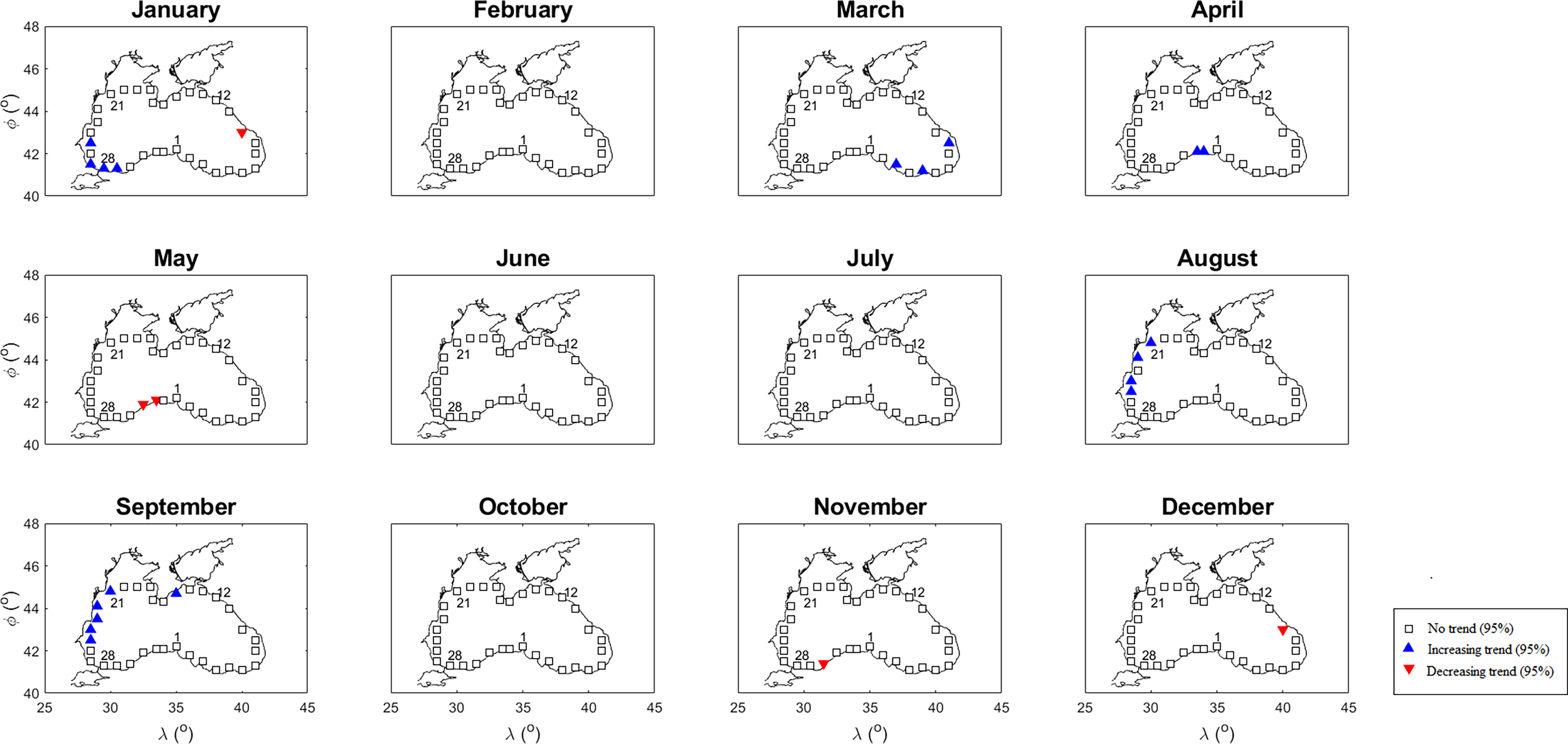 The Mann-Kendall Test results at 95% confidence level for mean and maximum SWH and WS are shown in Figures 2–5, respectively. A significant trend was not observed in approximately 89% of all time series (33 locations x 12 months) of mean SWH (Figure 2). No trends were detected in April, June, July, and October. Increasing trends in March (six locations), August (sixteen locations) and September (ten locations) and decreasing trends in May (five locations) are noteworthy. Trends detected in other months are limited to a few locations. Increasing trends were concentrated in the southeast for March and in the northwest for August and September. Decreasing trends were generally observed at locations in the southwestern part. For the maximum SWH (Figure 3), no trend was observed in any location in February, June, July, and October. There is no trend in approximately 94% of the all time series, but an increasing trend is detected in 5%. Increasing trends were observed in January, August, and September and mostly in locations in the western region.