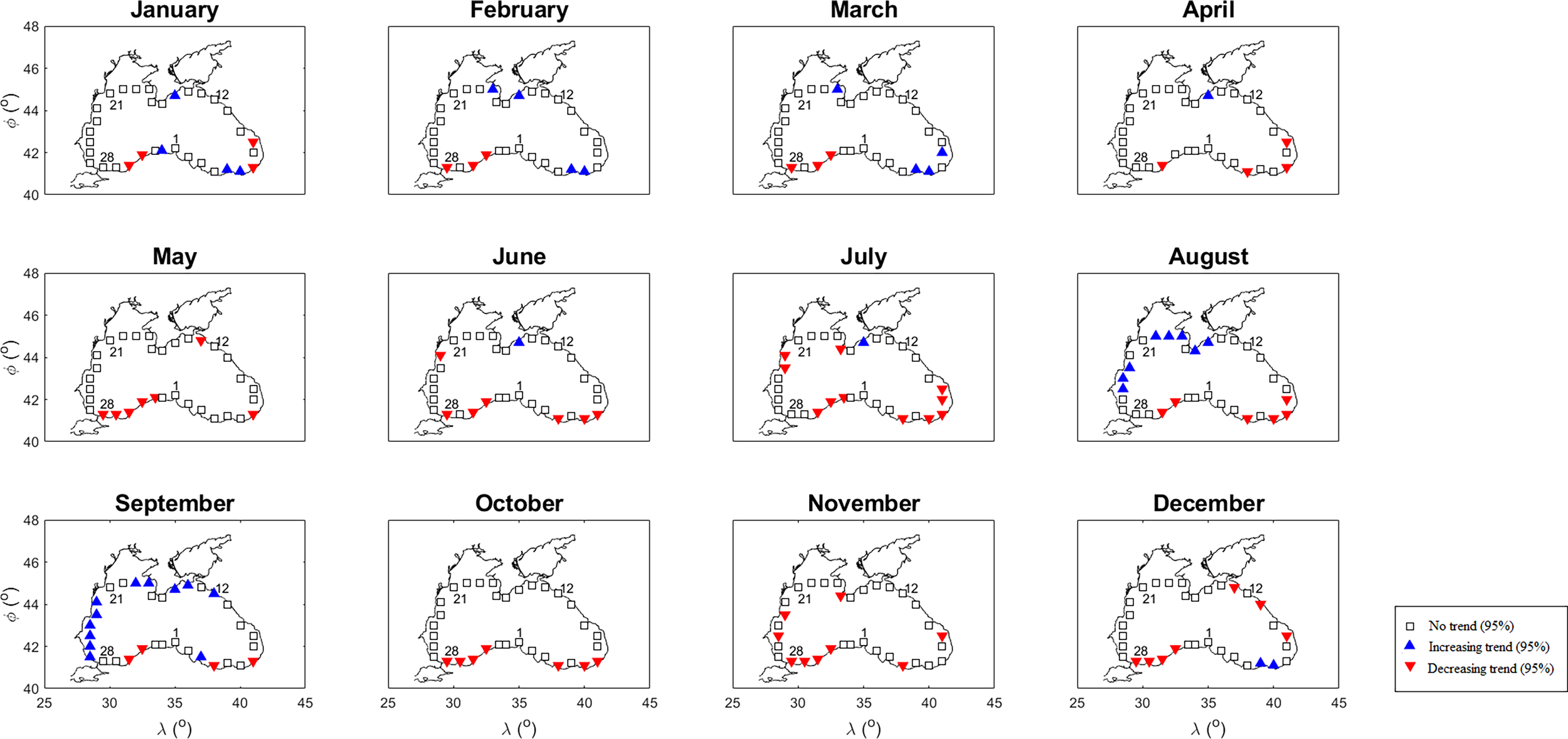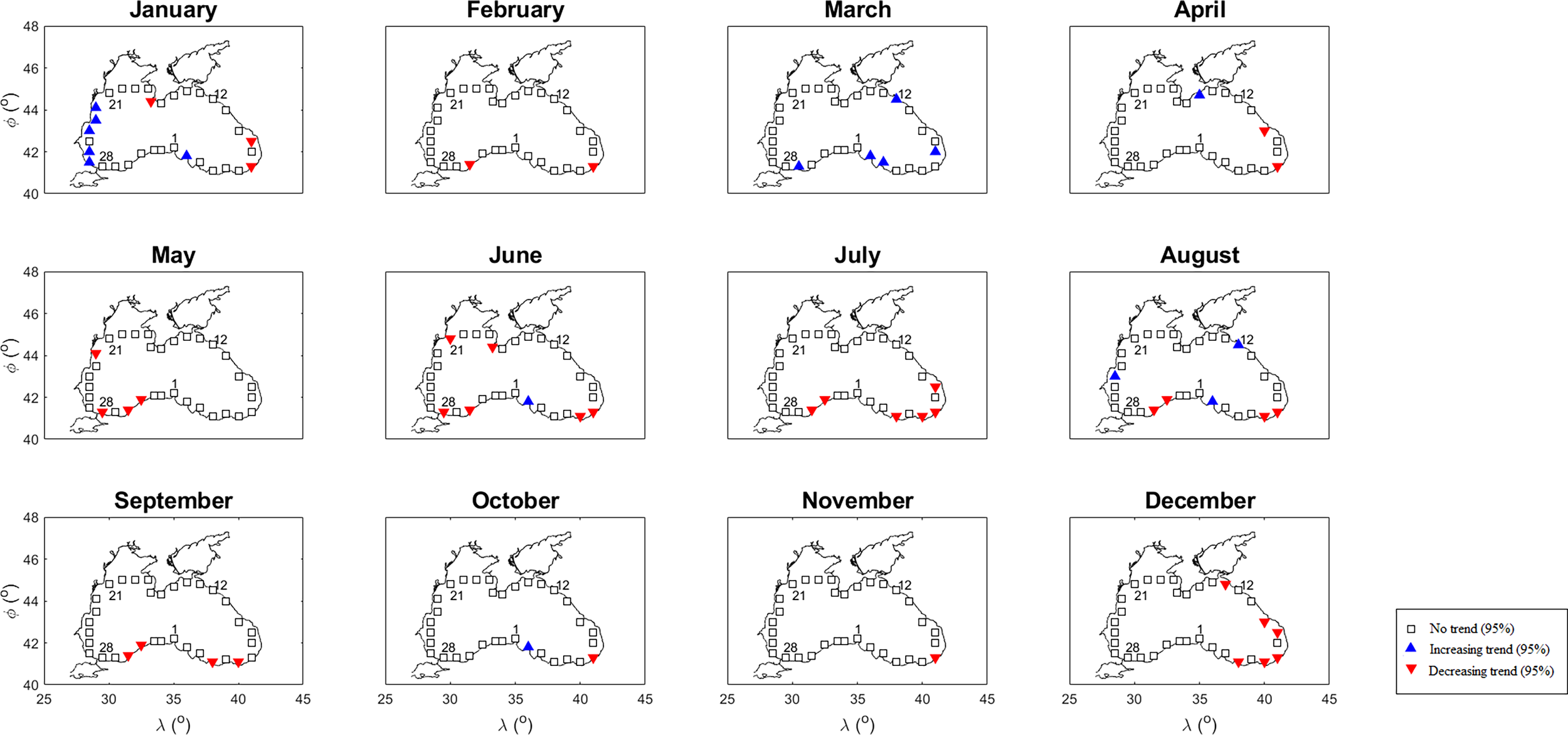 Figure 4 presents the monthly Mann-Kendall test results of mean WS. Similar to the mean SWH, increasing trends in the western and northern regions were observed in August and September. A decreasing trend was observed in all months at location 30, located in the southwest. An increasing (decreasing) trend was detected in the winter months (other months) in the some locations belonging to the southeast part where the trend was determined. No significant trends were found in 340 of the 396 (33 locations x 12 months) months (33 locations x 12 months) for maximum WS (Figure 5). In the southeast (west) region, the decreasing (increasing) trends in July and December (January) are noteworthy.