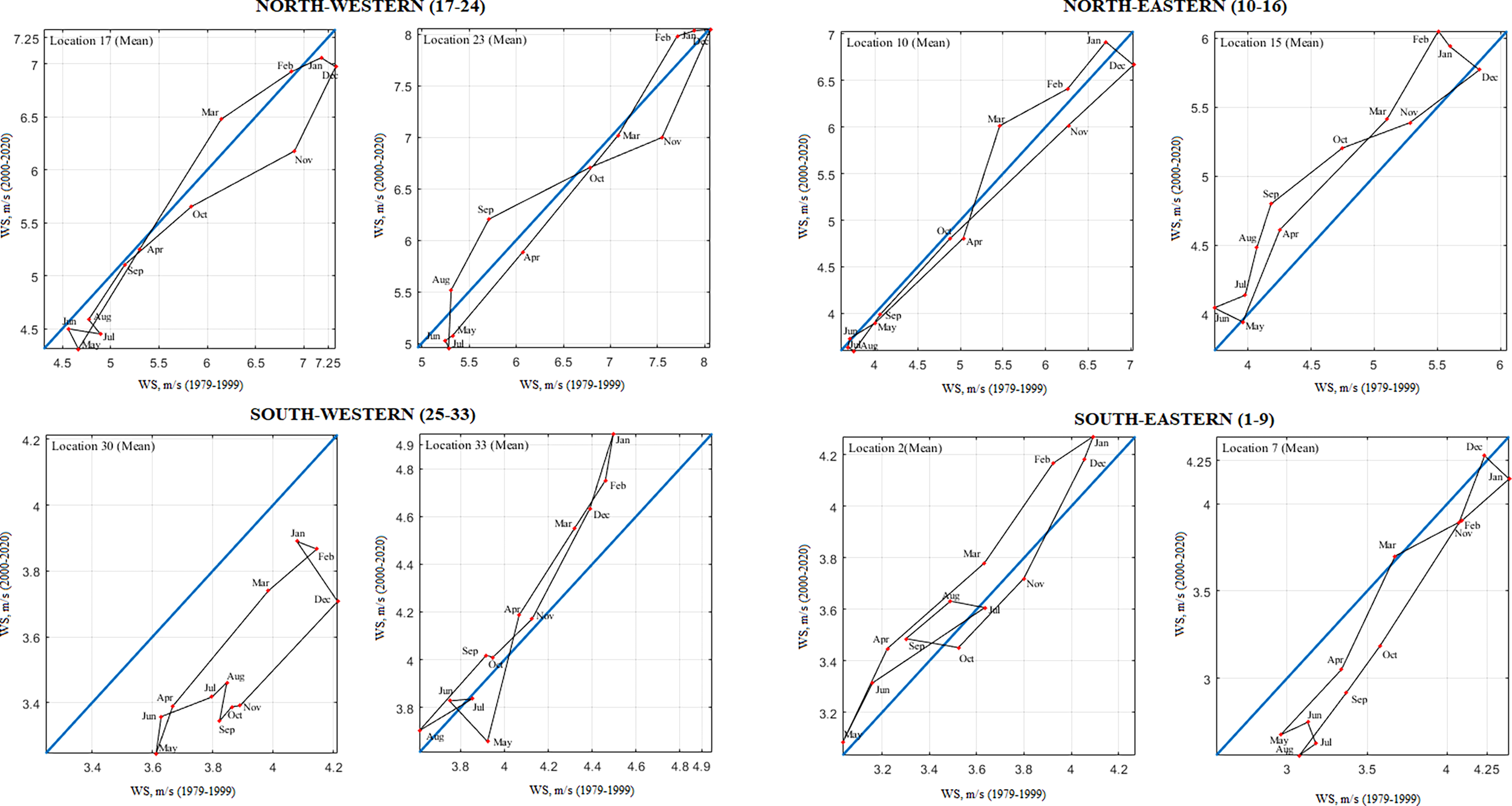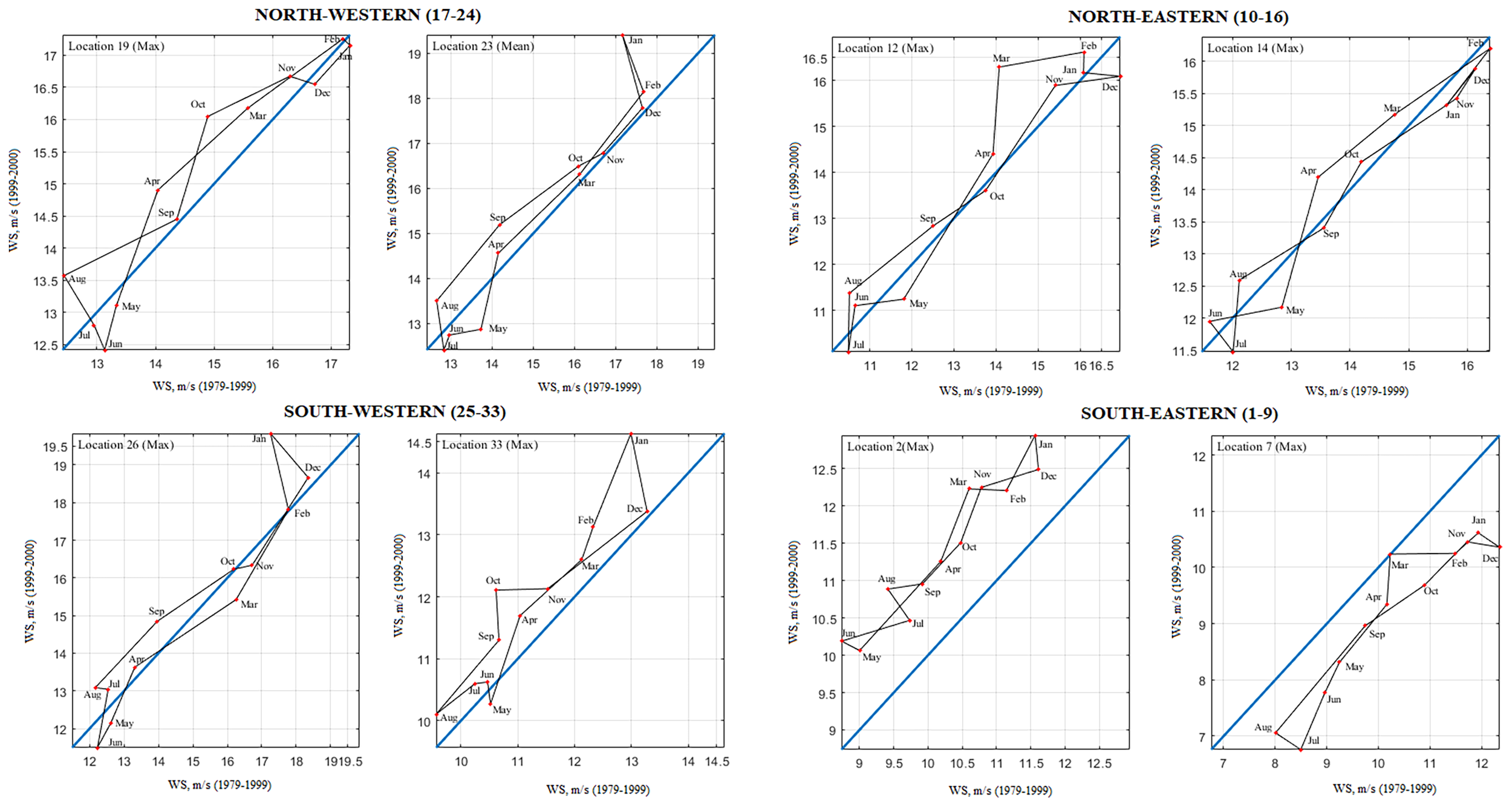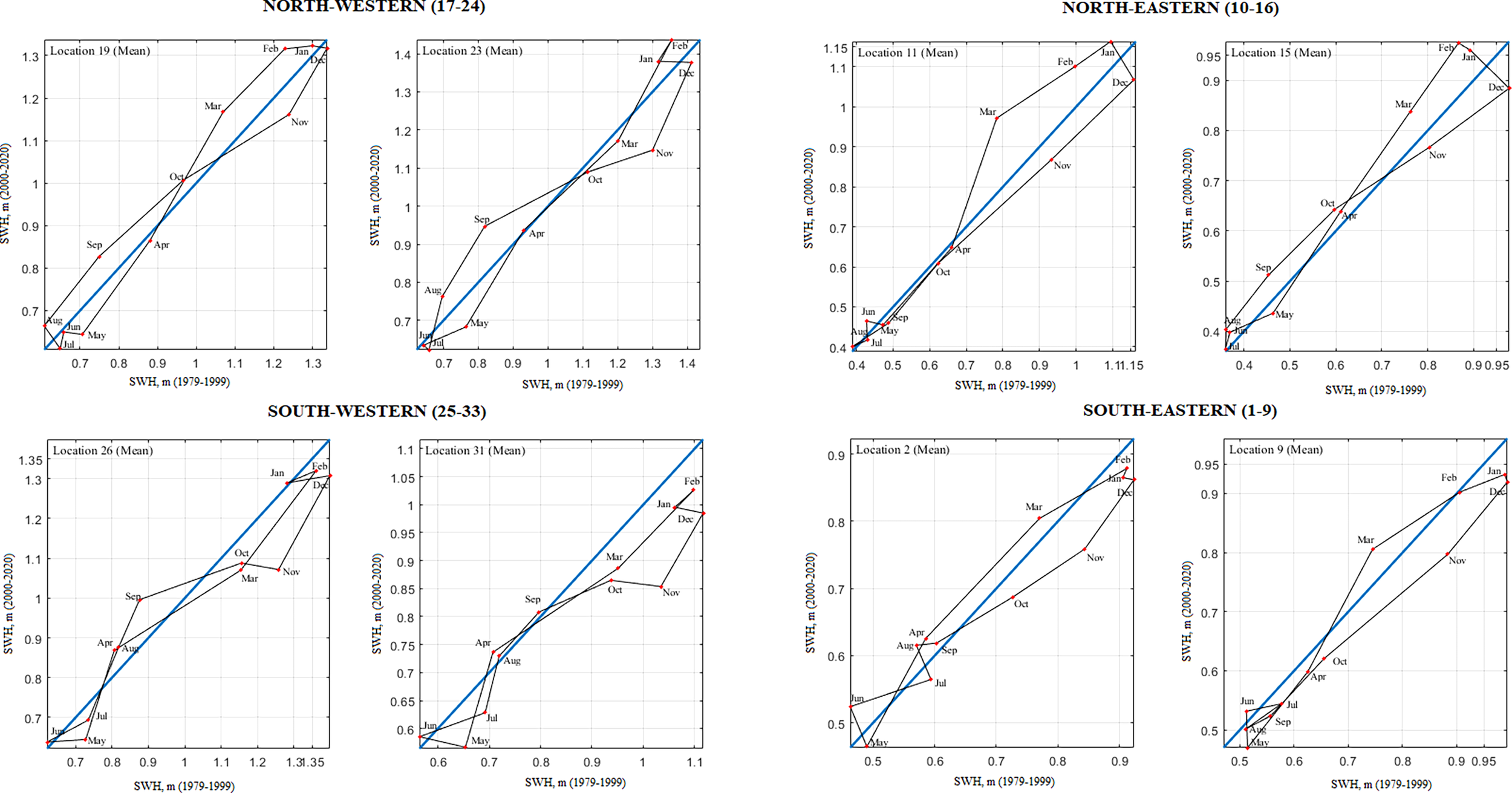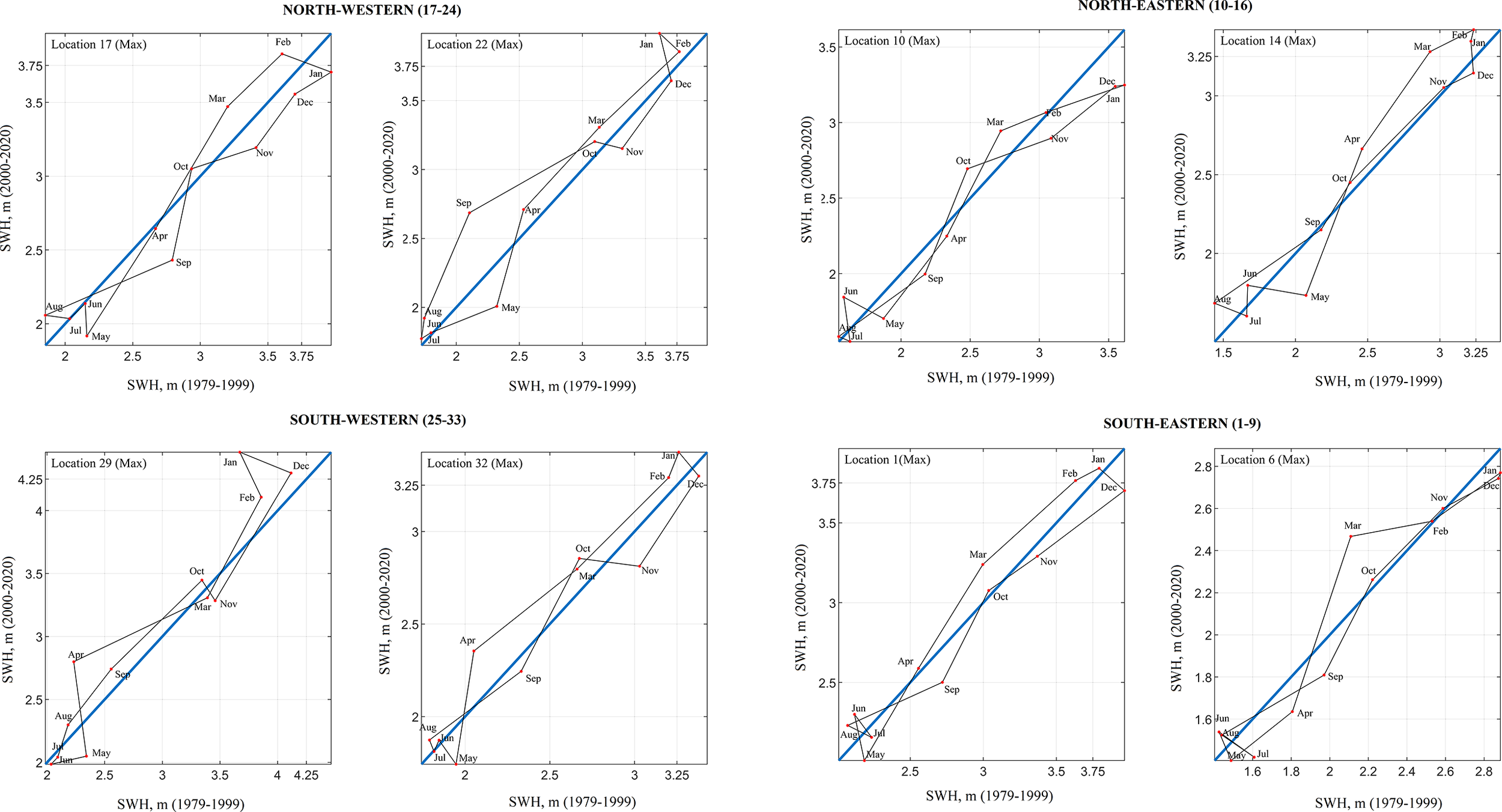 The graphs of the IPTA were obtained for 33 selected locations. A single plot for locations with similar characteristics was presented to provide a summary presentation and ease of review. Results were given for eight locations, two in each of the four identified regions (Figures 6–9). Eight different locations were preferred to evaluate different wind and wave parameters. Trends for the months are seen in the IPTA charts visually. However, when querying the trend assets of the months the relative error percentage (α) between two half series is required to be greater than 5%, as mentioned in the method section 2.3.2. Tables 1–4 are considered a significant trend only in the months that meet this condition. The IPTA graphs for the monthly mean SWH are shown in Figure 6. Significant trends detected in mean SWH are shown in Table 1. While a narrowing polygon structure was observed in the summer months at the locations in the southeast (locations 1-9) region, a wider polygon was encountered in the spring and winter months (Figure 6). The lowest (highest) SWH values are observed in the summer (winter) months when the one-year behavior is examined. Especially the increasing (decreasing) trends in March (November) are stronger in terms of distance to the 45° line. The transitions between February-March-April and October-November-December are large compared to the others. In October, November, and December, the transitions were increasing. They still remained in the decreasing trend region because mean SWH values in the second half were lower than in the first half. Transitions between February–May period show a decrease. At locations 11 and 15 in the northeast region (locations 10-16), a significant increase (decrease) was observed for the mean SWH values in the January-March period (December). In the northwest (locations 17-24) locations, two separate loops were formed for low and high values. Transitions from July to August were from decreasing area to increasing area. A significant decreasing trend was observed for May and July and the October-December period (locations 25-33). The significant decreases in value in the second half of May, July, November, and December caused a complex structure in the transition between the months, with five different polygons. The IPTA graphs between successive months for the monthly maximum SWH were presented in Figure 7. Table 2 shows significant detected trends in maximum SWH. Similar to the mean SWH, the highest (lowest) values were observed in the winter (summer) months for all locations. A wide loop starting from October and ending in March-April was formed at the upper values. Strong increasing (decreasing) trends were observed in March (May) in most locations. For maximum SWH, a complex structure was observed in which more than two loops were formed.