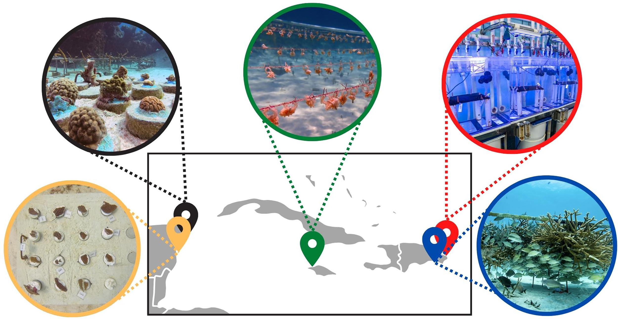 Global warming is impacting ecosystems at an increasingly alarming rate, with few ecosystems affected as heavily as coral reefs. Ocean warming and acidification are the primary drivers of reef decline on a global scale (Albright and Langdon, 2011; Arias-González et al., 2016; Hughes et al., 2018), while overfishing, destructive fishing practices, hurricane damage, nutrient and sediment pollution, and poor management of coastal development, among others, synergistically affect reefs at local scales (Hughes and Connell 1999; Gardner et al., 2005; Anthony et al., 2014; Hughes et al., 2017; Hughes et al., 2018). As a result, reefs are facing a rapid global decline with a bleak future that will compromise their services to marine ecosystems and society (Pratchett et al., 2014). Due to differences in local pressures, as well as contrasting evolutionary histories and environmental conditions, there is heterogeneity in the state of the reefs across geographic regions, with Caribbean reefs experiencing arguably the strongest negative shift in ecosystem state in recent decades (Cinner et al., 2016; Beyer et al., 2018; Cortés-Useche et al., 2019; Roff, 2021). The deterioration of Caribbean reefs has been documented since the 1970s, with a 50% decline in reef-building coral cover in recent decades and an increasing dominance by macroalgae, sponges, and the hydrozoan Millepora spp. (Mumby et al., 2007; Maliao et al., 2008; Cramer et al., 2021). This catastrophic decline in coral cover and diversity has largely been attributed to a loss of key herbivores shifting the competitive balance on the benthos in favor of macroalgae (Lessios et al., 1984; Hughes, 1994) and an increasing prevalence of coral diseases (Gladfelter, 1982; Precht et al., 2016). While these issues persist, a lower coral diversity and difference in evolutionary histories compared to their Indo-Pacific counterparts compromises sexual recruitment, which limits the recover potential of Caribbean coral communities (Roff, 2021). Furthermore, the frequency and intensity of mass bleaching events has increased in the region, since the first region-wide event in 1987 (McWilliams et al., 2005; Manzello, 2015), hampering recovery and resilience further. Coral bleaching is now one of the major threats to the region (Eakin et al., 2010). Yet, bleaching events can affect corals heterogeneously at different scales even at the level of species and colonies, promoting the adaptation to future conditions (Baker et al., 2008; Thomas et al., 2019; McClanahan et al., 2020). Nonetheless, since the current rate of environmental change is greater than that required for natural adaptation, active intervention through restoration efforts, in combination with efforts to reduce carbon emissions and localized pollution, are increasingly being developed as necessary approaches to aid the recovery of reef-building corals in this region (Rinkevich, 2015; Cortés-Useche et al., 2021; Suggett and van Oppen, 2022).