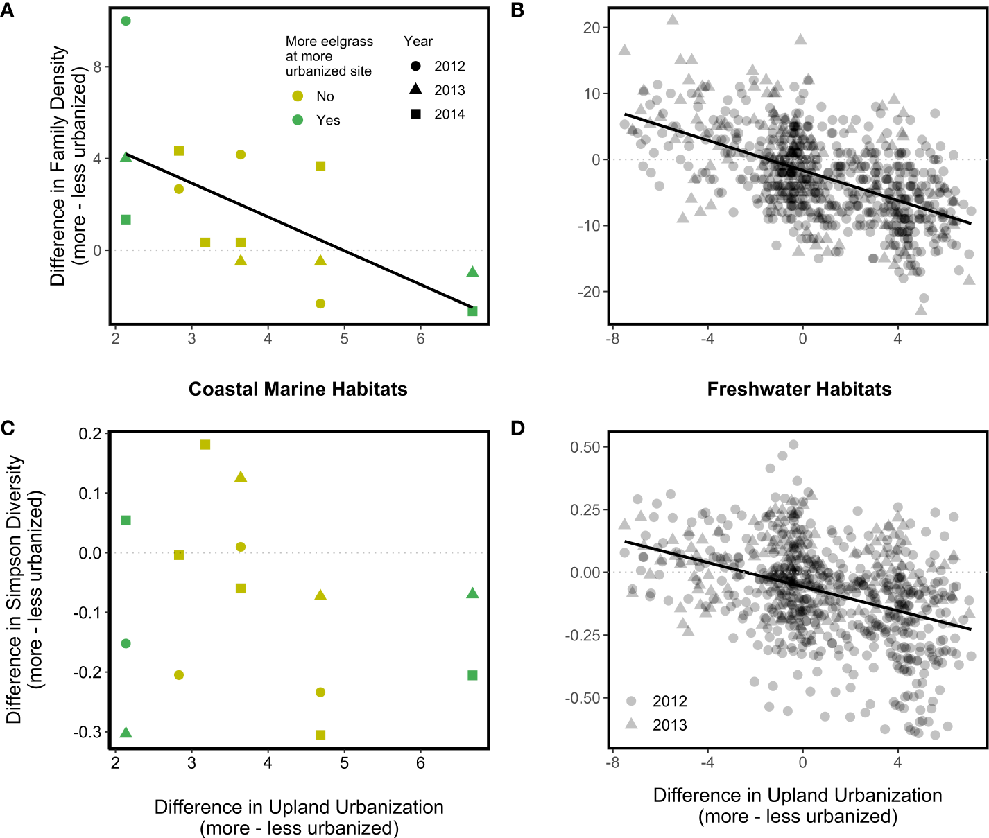 In freshwater habitats, family density difference (Figure 2C) in 2012 (p < 0.001) and 2013 (p < 0.001) and Simpson diversity difference (Figure 2D) in 2012 (p < 0.001) were negatively associated with the upland urbanization index difference, such that more urbanized watersheds tended to have lower family density and Simpson diversity than less urbanized watersheds. The Simpson diversity difference in 2013 also demonstrated a negative relationship with the upland urbanization index difference, but this relationship was nonsignificant (p = 0.11).
