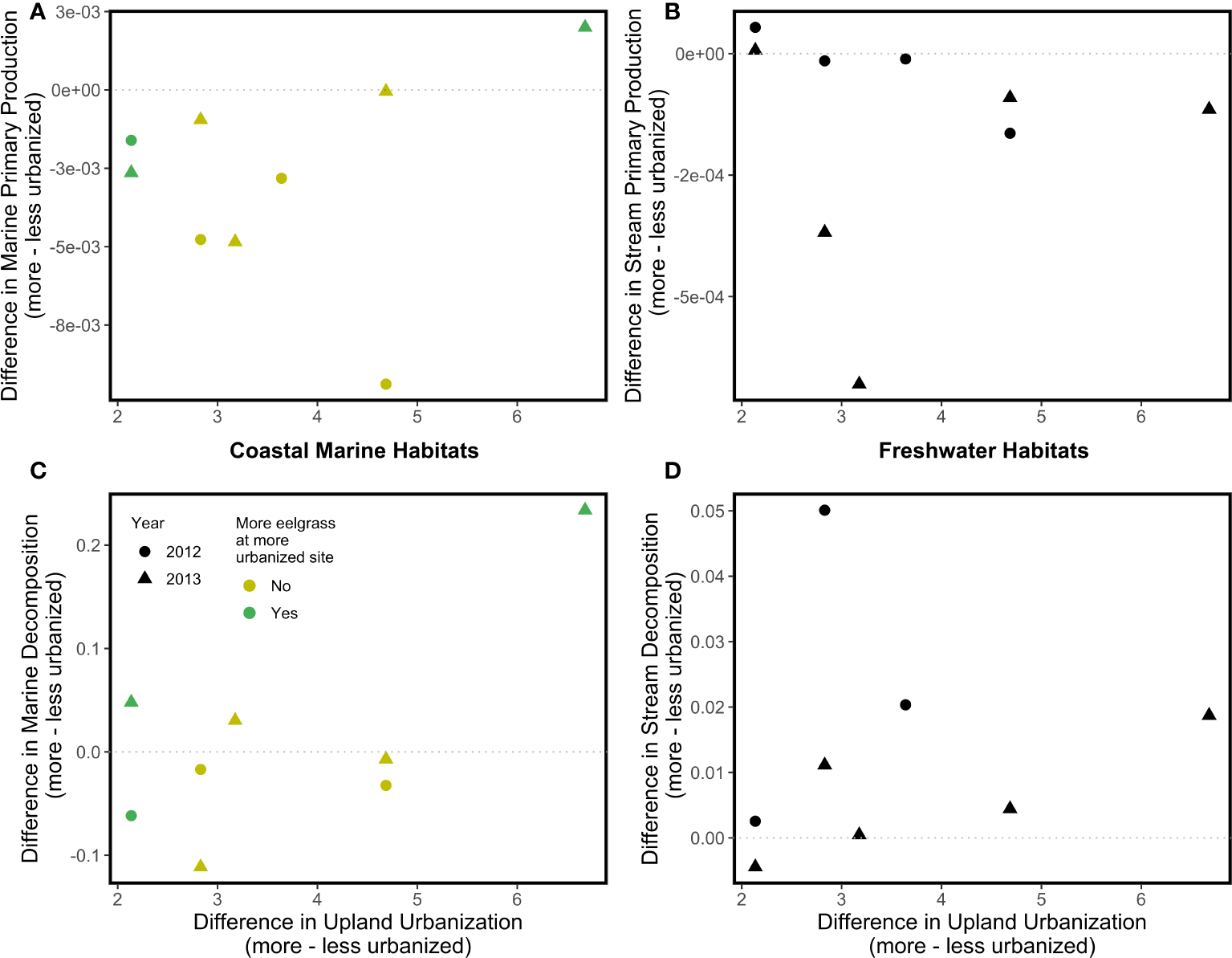 Associations between the upland urbanization difference and disparity between more and less urbanized watersheds in two ecosystem functions (top, Net Primary Productivity; bottom, Decomposition) in coastal marine (A, C) and freshwater (B, D) habitats. No regressions were statistically significant; dotted lines serve as a reference representing zero difference in the ecosystem properties between more and less urbanized watersheds.
