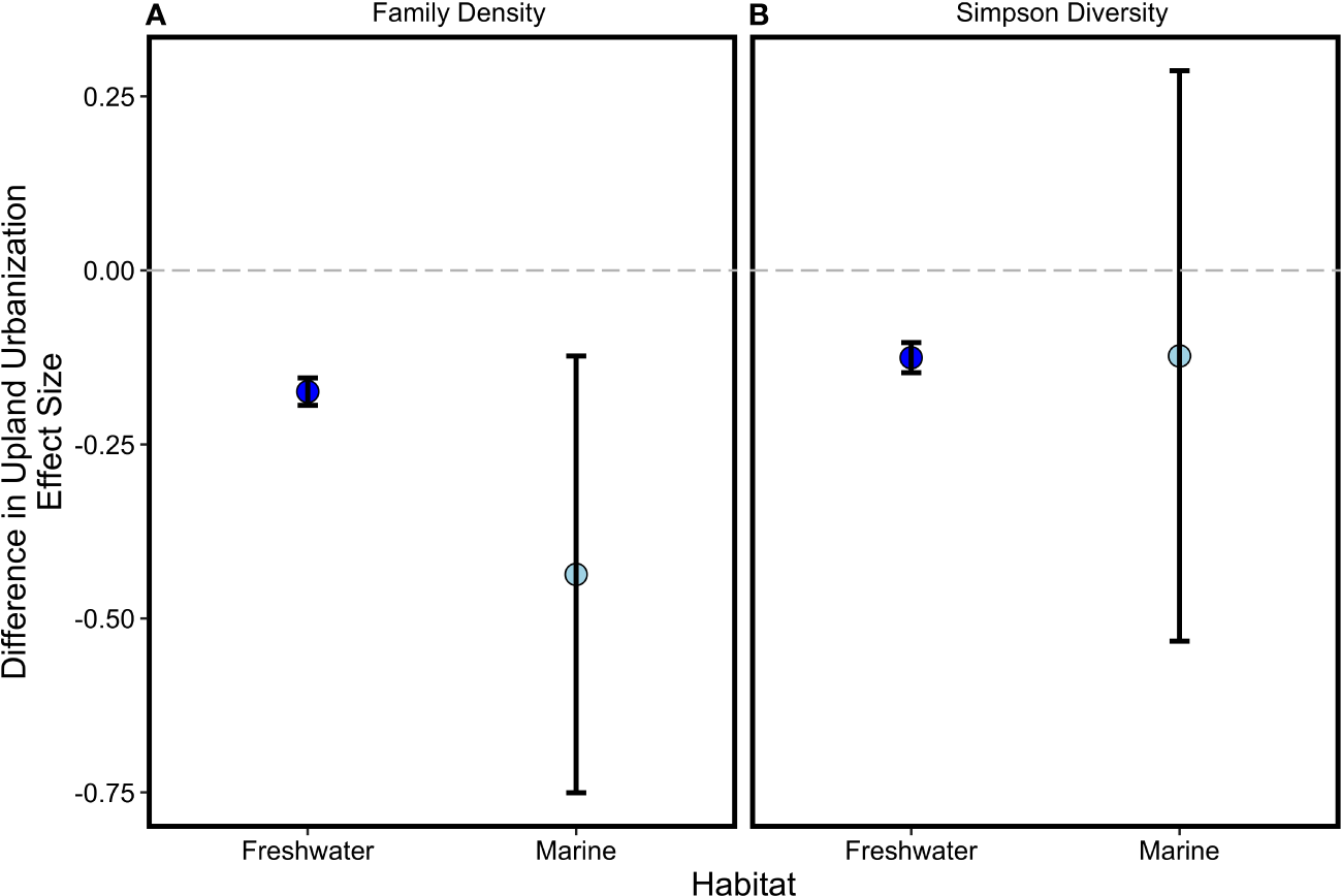 Mean effect sizes (with 95% CI) for relationships between biodiversity differences [(A) family density; (B) Simpson diversity] and differences in the upland urbanization index in freshwater and coastal marine habitats. Effect sizes related to two ecosystem functions (net primary productivity and decomposition) also did not differ between habitat types (not shown).