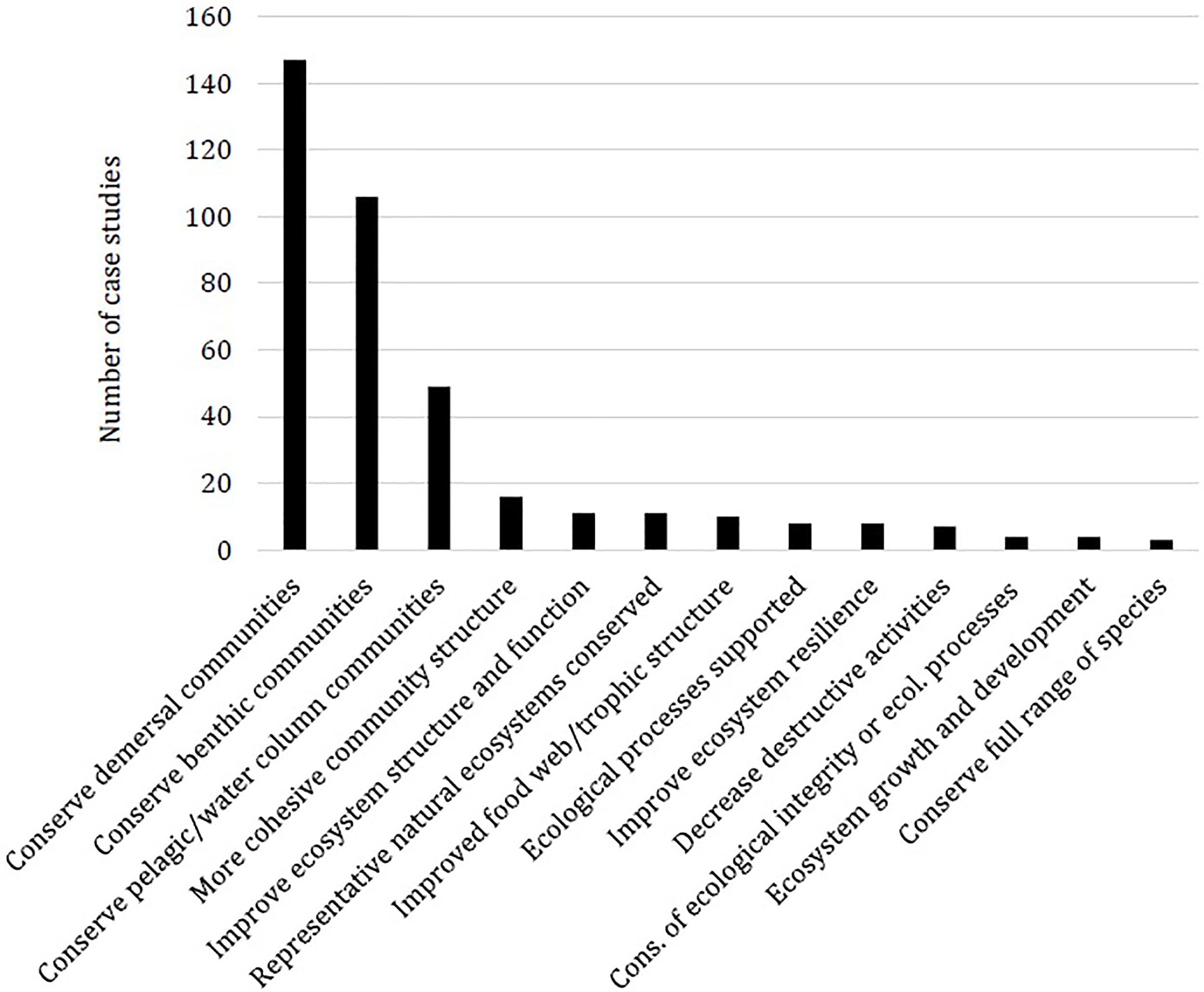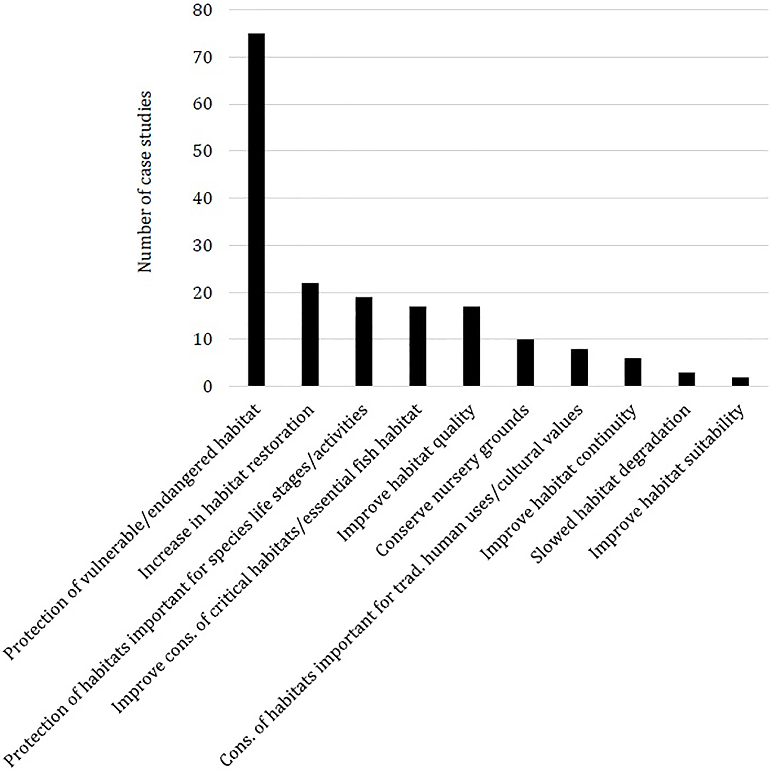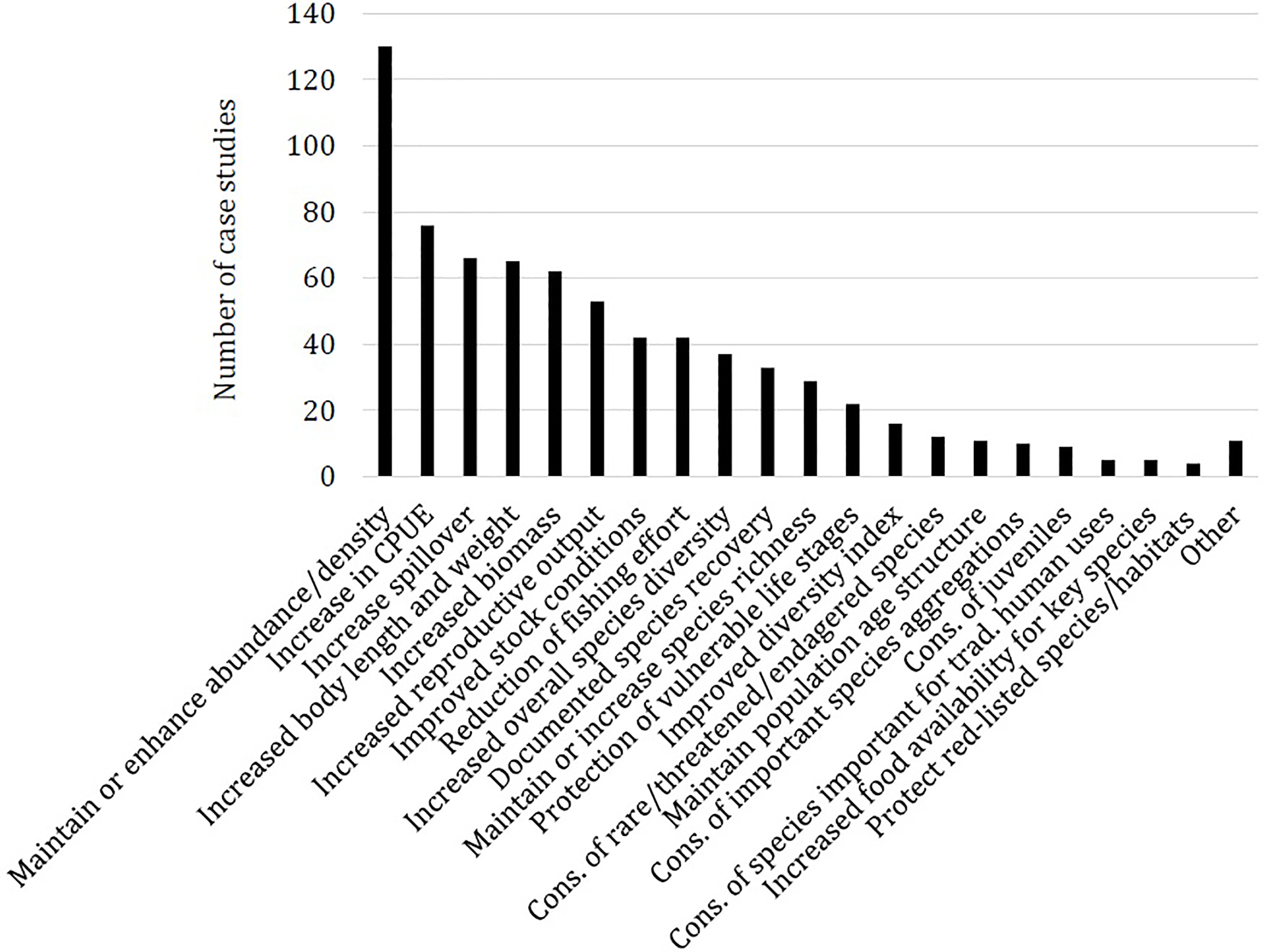 To evaluate performance against Criterion C—achieves sustained and effective contribution to in situ conservation of biodiversity—we analyzed the information reported in the publications regarding the perceived or measured consequences for biodiversity resulting from the fisheries ABMT. For fisheries ABMTs to be recognized as OECMs and to contribute toward the achievement of the global biodiversity conservation goals, it is imperative that they contribute to positive biodiversity outcomes. Although fisheries ABMTs are managed to support the sustainable use of fisheries resources, biodiversity conservation is not usually the primary objective of fisheries ABMTs and their contribution to biodiversity might be overlooked. Therefore, we deemed it necessary to explore in more detail the biodiversity conservation outcomes provided by the fisheries ABMTs identified in this literature review. To do so, we used emergent coding to record and group the documented biodiversity conservation outcomes for each individual case study. We categorized the outcomes based on population/species, habitat, or ecosystem level. We note that the range of such reporting is varied in nature, and in data-limited situations, often narrative information collected from fishers is the best information available. It was not always known if controls in place were “likely to achieve (net) positive biodiversity conservation” in the presence of local pressures outside the control of area managers (e.g., human and natural pressures at larger spatial scales than the area, such as fishing pressures operational outside the area; unprecedented heat waves caused by climate change; or natural pressures, such as storms and cyclones). Therefore, as long as a positive biodiversity outcome was mentioned by the case study authors, the case study was scored positively.