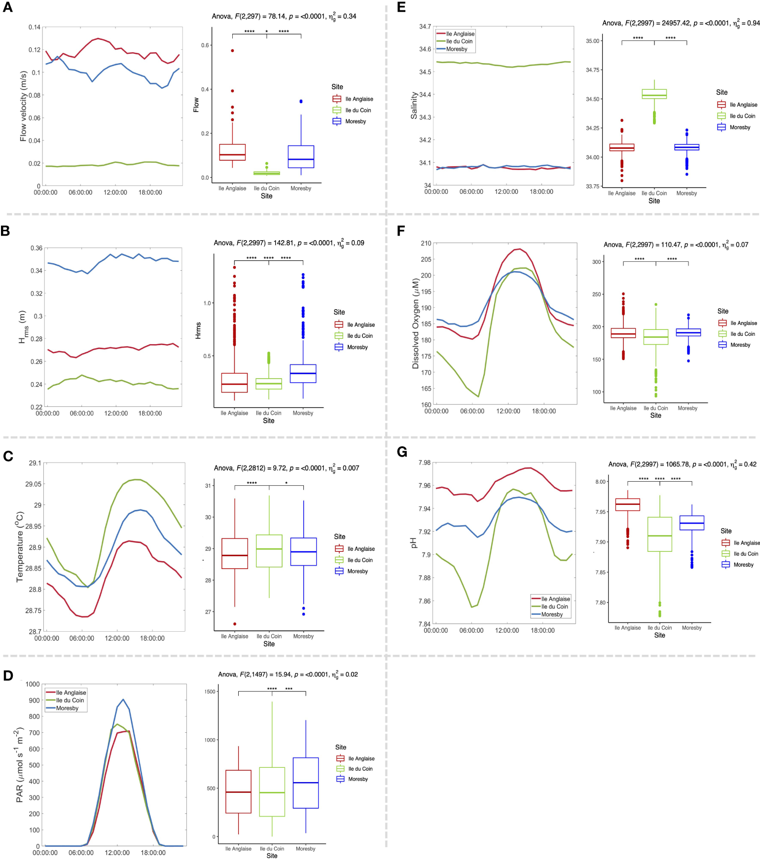 Average diel cycle plots for (A) flow velocity, (B) root-mean-square wave height, (C) in situ temperature, (D) photosynthetically active radiation (PAR), (E) salinity, (F) dissolved oxygen (DO), (G) pH, and, and boxplots displaying values across subset datasets for each parameter, along with corresponding one-way ANOVA test results [including F-statistic with degrees of freedom, p-value, and effect size (generalised eta squared (ng2)].